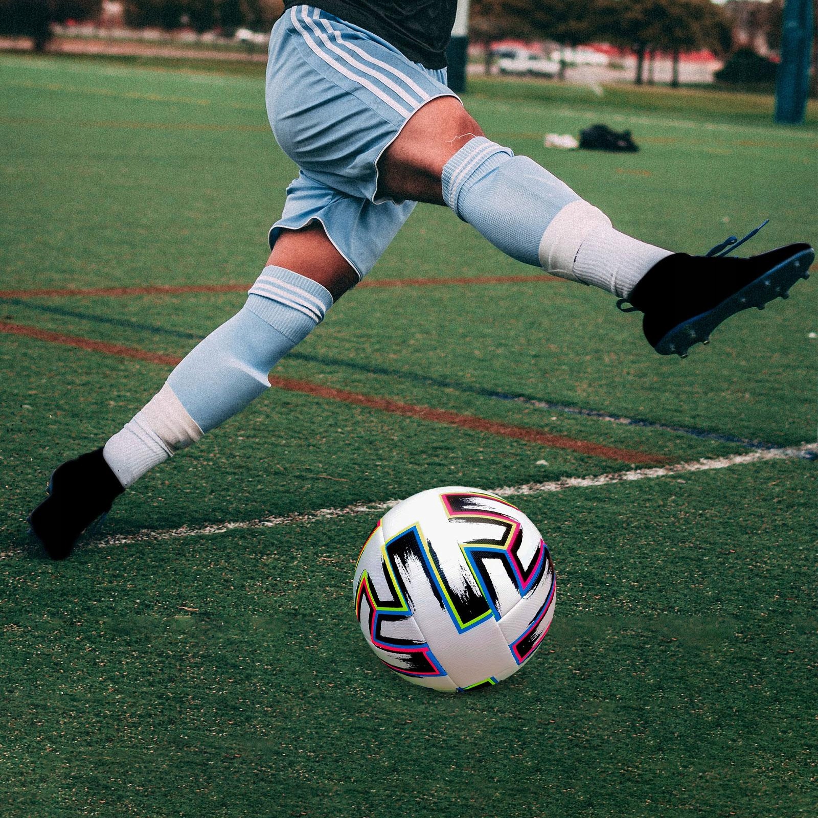 [Преміум -матеріал] Футбол у розмірі 5 виготовлений з високоякісної шкіри ПУ, сильна та відмінна майстерність та тривале використання. Футбол - це м'яч у розмірі 5, діаметром близько 21,5 см/8,46 дюйма, що характеризується навіть тиском, що забезпечує стабільний політ у повітрі. широко підходить для ігор, професій, навчання, вправ тощо