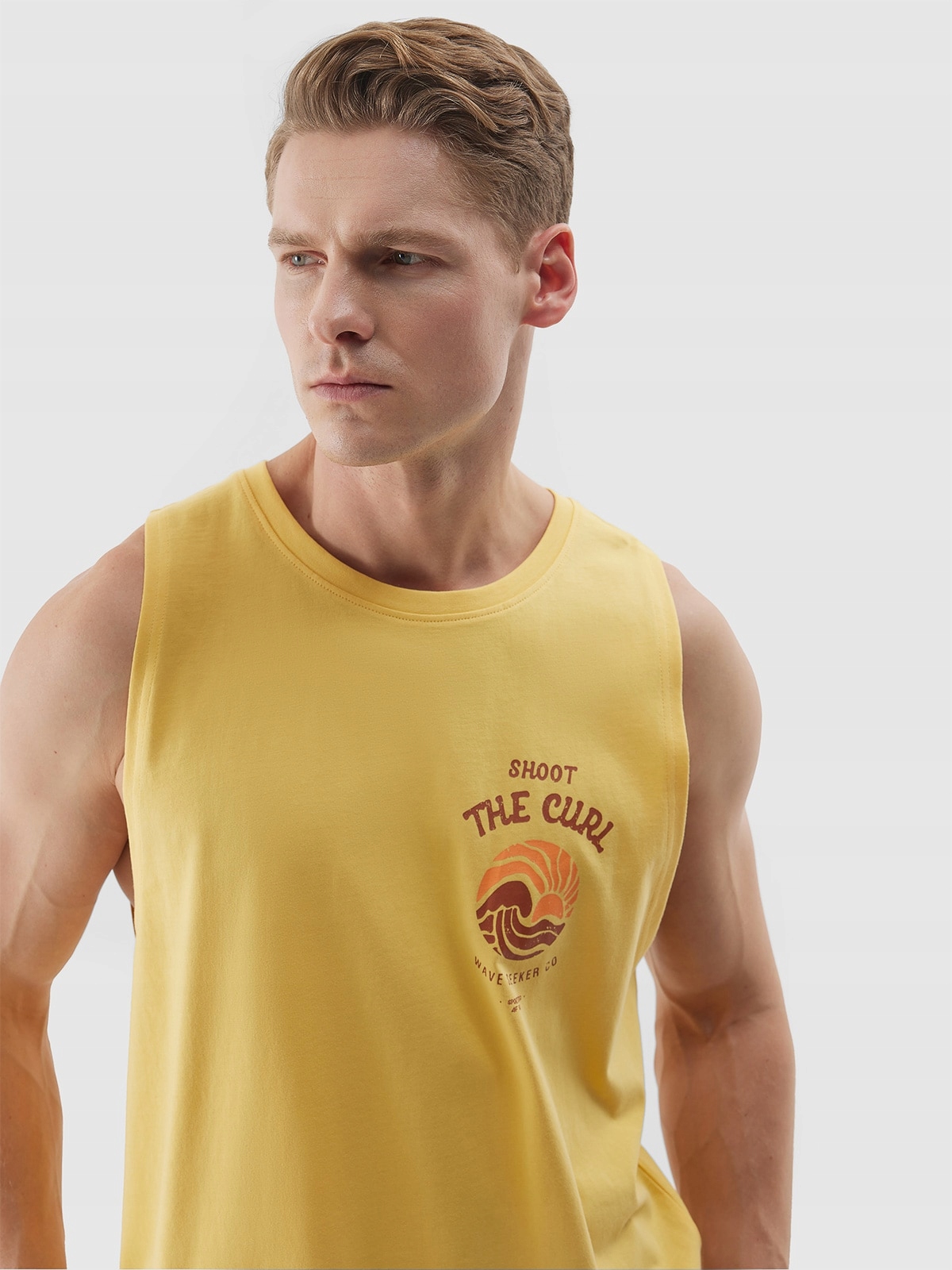 Чоловіча безрукавка виготовлена зі 100% бавовни, що робить її м’якою, довговічною та приємною на дотик. Круглий виріз горловини оброблений легкими ребрами. Спереду видно принт із зображенням серфінгу. Більш широкі бретелі.