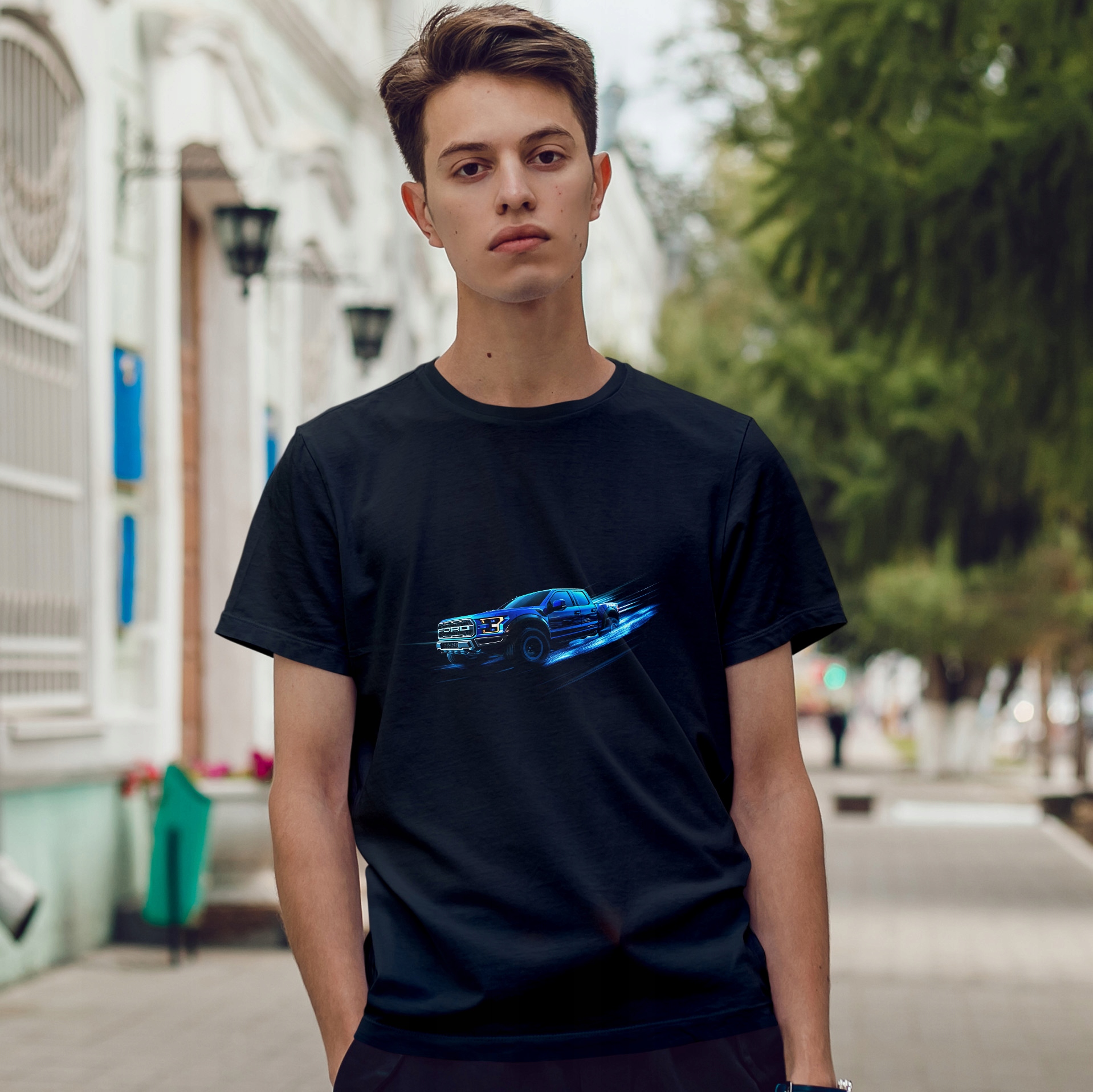 Принт на футболці демонструє динамічний образ Ford F-150 Raptor, підкреслюючи його надійність і потужність.