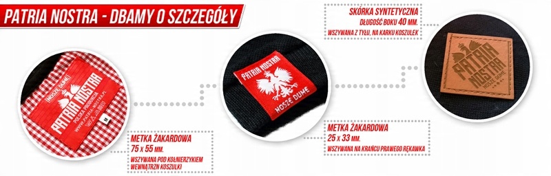 Сорочка поло має фірмові аксесуари у вигляді 2-х жаккардів і скіна з логотипом бренду Patria Nostra, розміщеним на шиї. Застібка на 3 ґудзики та ремінець виготовлені з модного та елегантного сорочкового матеріалу. Біло-червоний картатий візерунок — ідеальний вибір, який ідеально поєднується з матеріалом футболки та аксесуарами. Додатковим акцентом, також віднесеним до національних кольорів, є тонка біло-червона смуга на комірі.