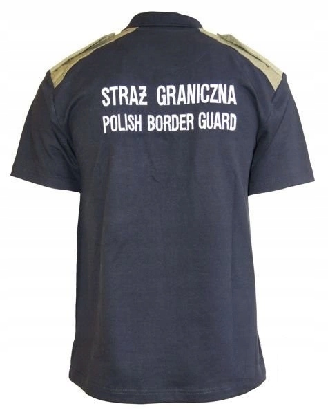 z tyłu na wysokości łopatek umieszczony jest duży napis "straż graniczna польська прикордонна охорона" wykonany haftem maszynowym, nicią w kolorze białym. Koszulka rozpinana pod szyją na trzy guziki.