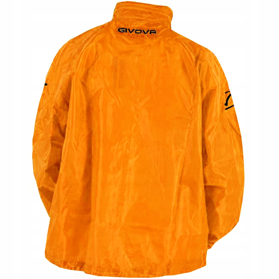 Чоловічий плащ Givova. Виготовлена з високоякісного нейлону. Капюшон ховається в комір-стійку. Куртка застібається на блискавку по всій довжині. Виріб помаранчевого кольору з чорною фурнітурою та чорним логотипом виробника на грудях.