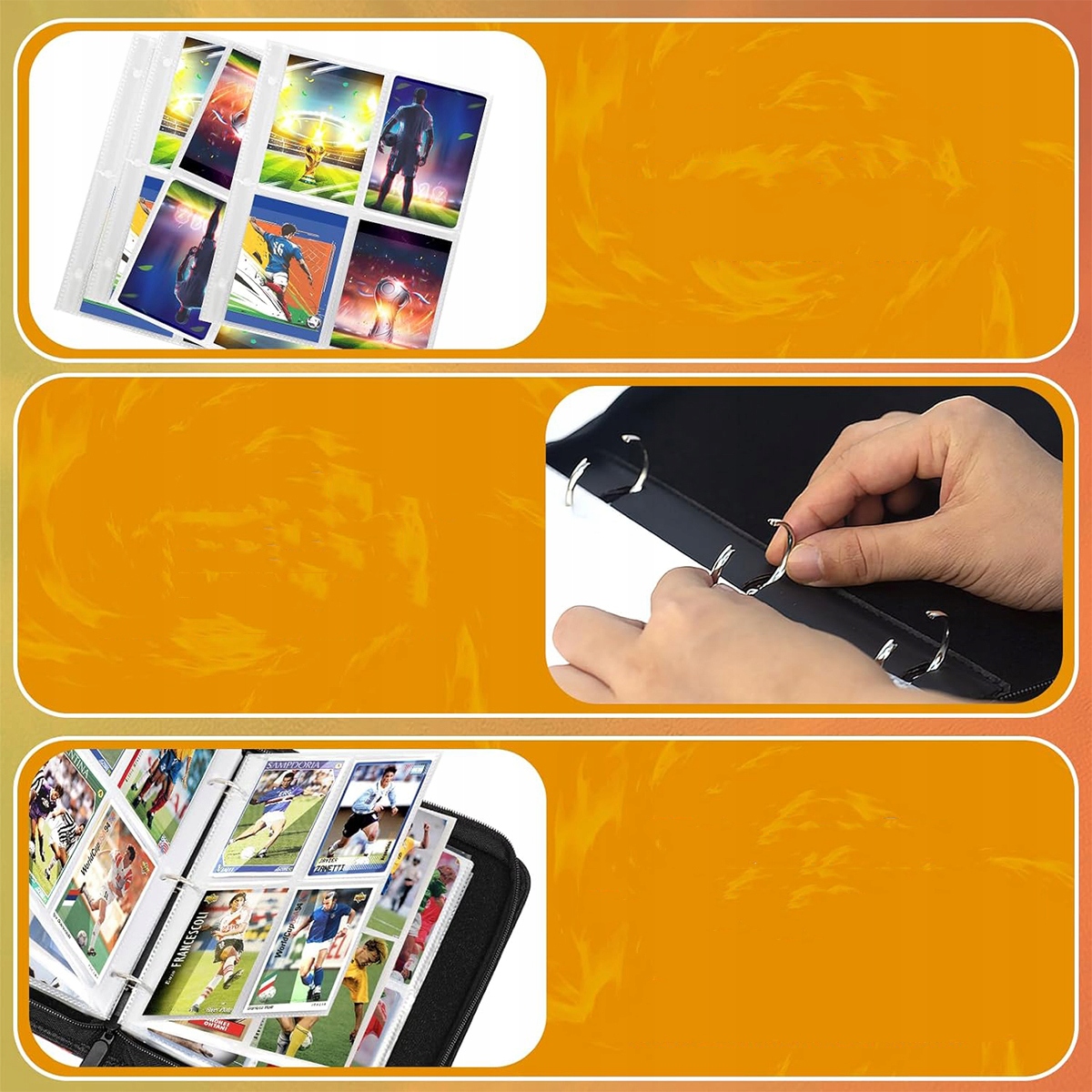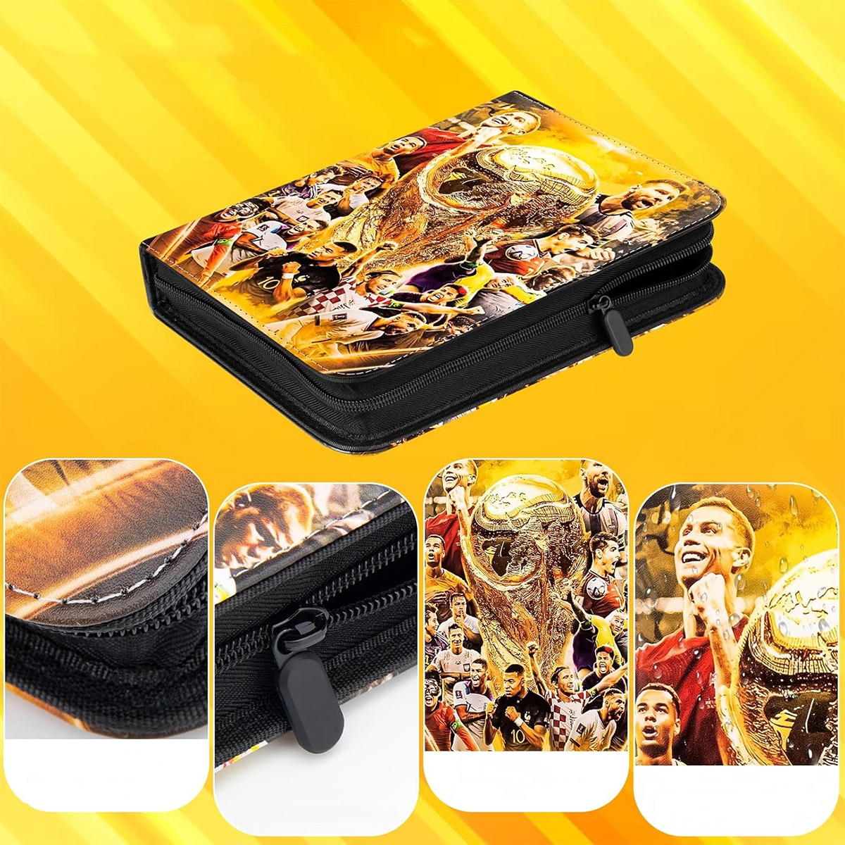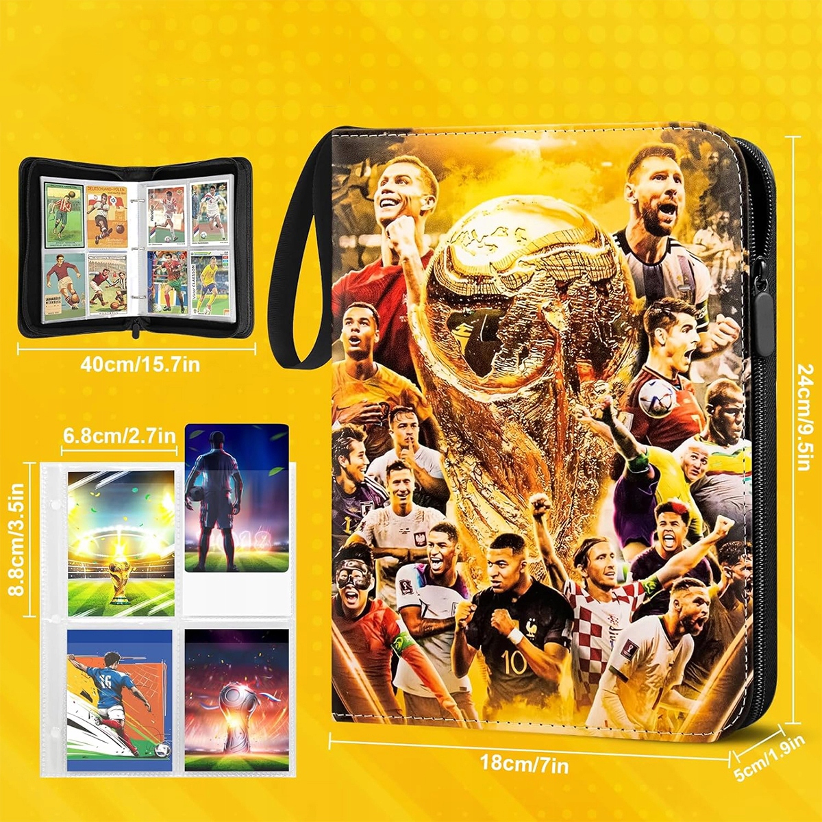 Ця папка для карток має міцну високоякісну блискавку та ручку, яка повністю захищає картки та чохли від випадання. Візерунки із зірками американського футболу на обкладинці надають альбому привабливого вигляду і неодмінно сподобаються любителям футболу. Зручний розмір і елегантний дизайн дозволяють легко брати альбом куди завгодно та показувати свою колекцію в дорозі.