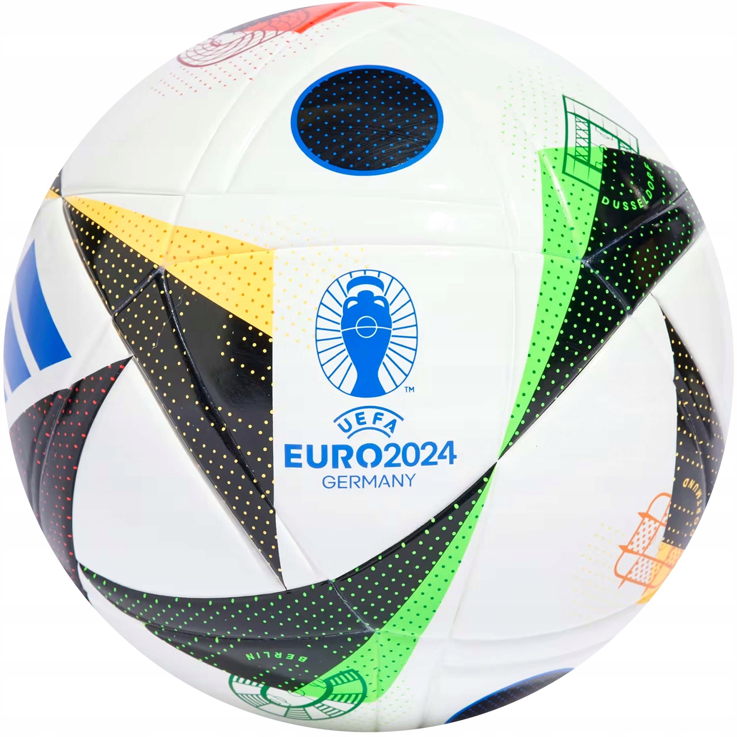 Відчуйте магічне хвилювання міжнародного футболу на найвищому рівні. ADIDAS FUSSBALLIEBE LGE LEAGUE J350 EURO 2024. М'яч отримав назву «Fussballiebe» (Football Love), що у вільному перекладі означає «Любов до футболу». М'яч Adidas Euro 2024 розроблений у білому кольорі з трикутними візерунками чорного, жовтого, червоного та зеленого кольорів. І логотип Євро-2024, і логотип Adidas на м'ячі сині. Кольори позначають 24 команди, які братимуть участь у турнірі. Меседж заходу полягає в тому, що це буде дружнє місце, де кожен почувається гостинним та з ентузіазмом відзначає свою різноманітність.