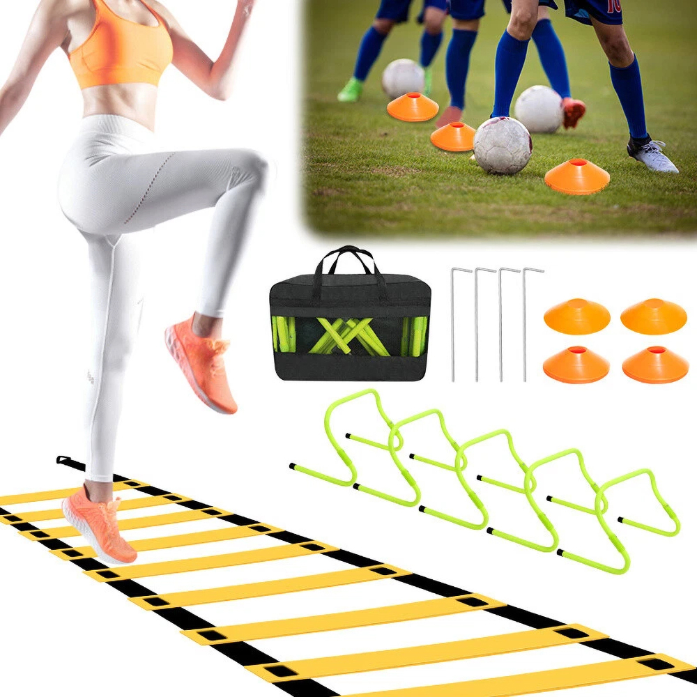 ⚽ Сільськогосподарський набір сільського господарства: Кожен набір включає драбину з 12 треками, 4 футбольними стовпцями, 5 регульованих швидкостей для тренувань зі швидкістю, 4 сталеві бруски для додаткової стабільності та транспортний пакет. Це дозволяє створити кумедний курс перешкод, підходить як для дітей, так і для дорослих, забезпечуючи години розваг, розваг та фізичних вправ.
