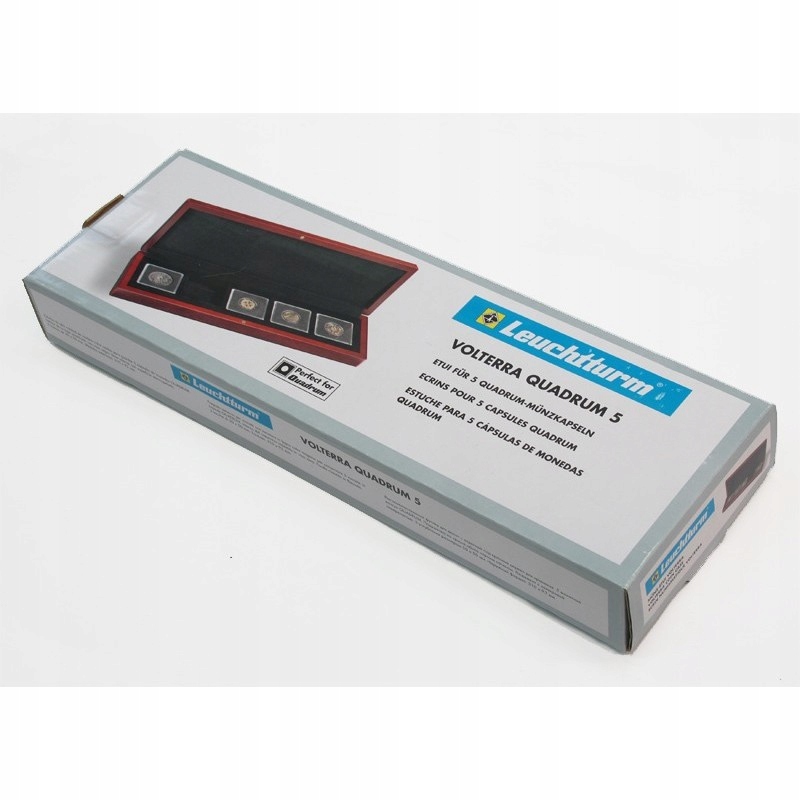 Кейс Volterra від Leuchtturm для чотирьох монет у капсулах quadrum. Виготовлений з високоякісної деревини червоного дерева. Оздоблення оксамитом (основа) і чорним оксамитом (кришка).