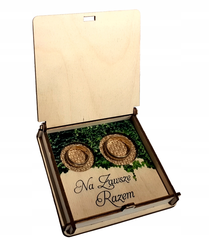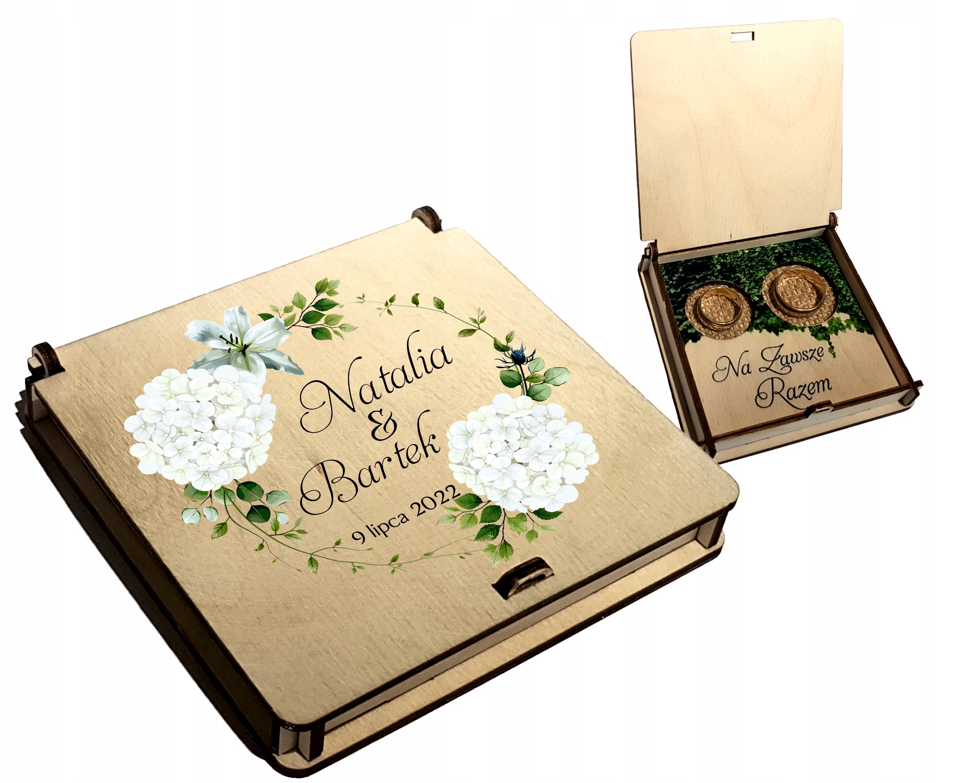 Коробка виготовлена з фанери товщиною 3 мм, прикрашена графікою - доступно 8 дизайнів. Місце для кілець обшито джутовою тканиною в поєднанні з соковитим зеленим мотивом.