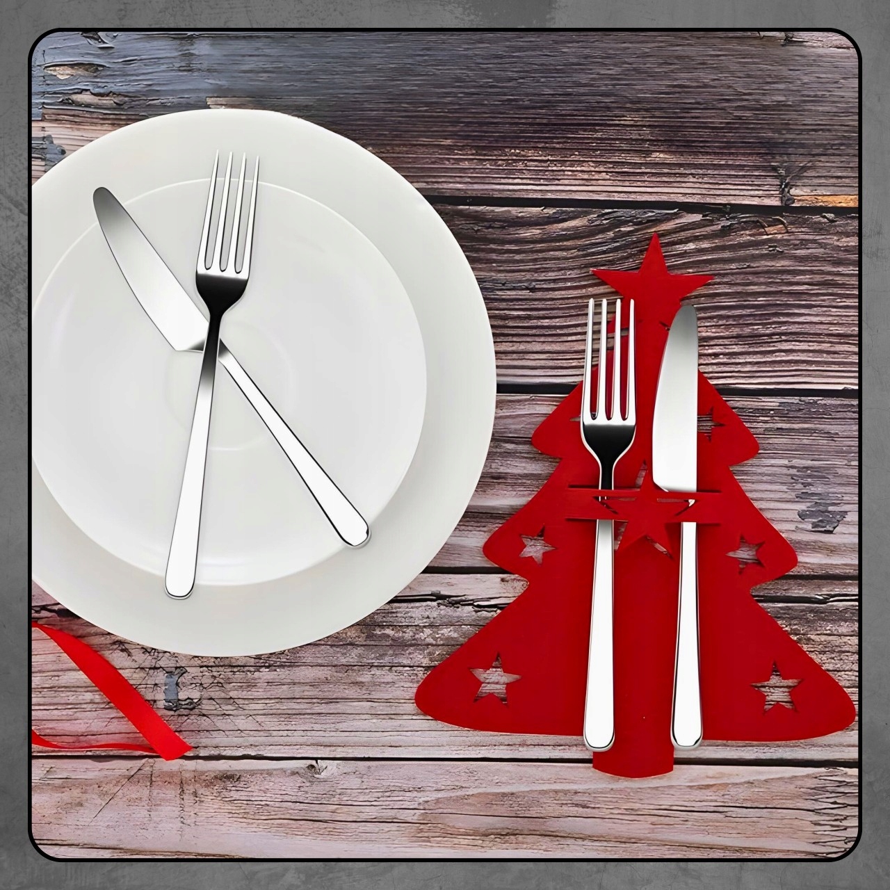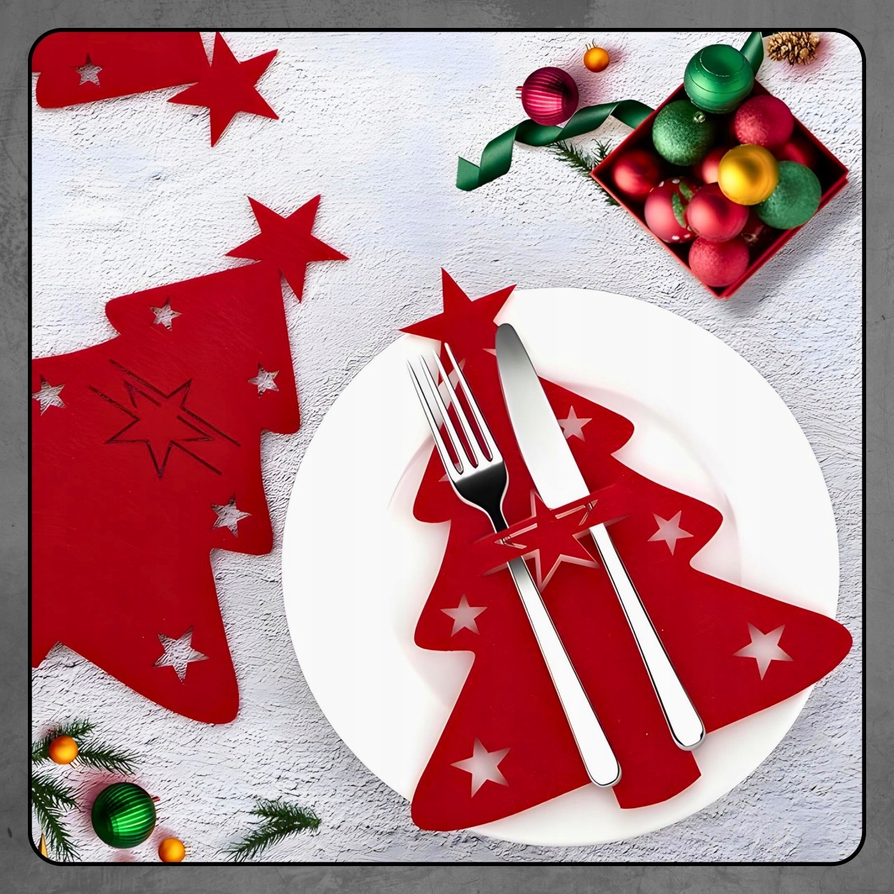 - Завдяки класичній формі ялинки та червоним кольорам футляри для столових приборів підходять до будь-якого різдвяного інтер’єру. Вони ідеально підходять як для сучасних, так і для традиційних композицій, додаючи різдвяного шарму та стилю будь-якому сервіруванню столу.