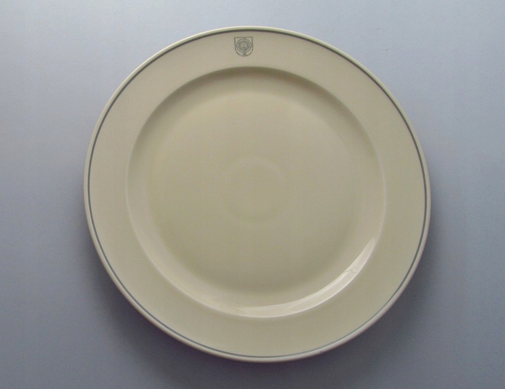 Діаметр цілих 31,5 см, відмінний стан, незначні сліди використання - мінімальна втрата по краю, ширина 3,5 мм, майже не видно, абсолютно не дискваліфікує тарілку. (дефект знаходиться на краю, з протилежного боку таблички від герба - видно на фото).