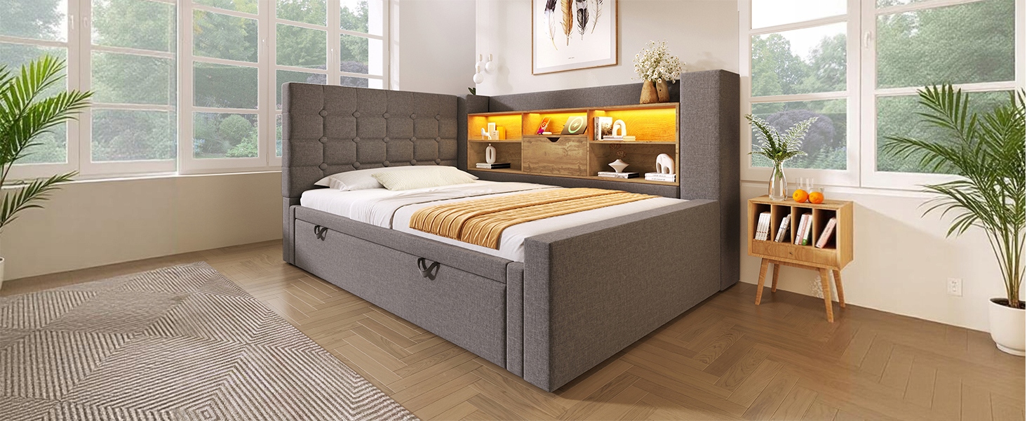 【Величезний простір для зберігання】Виріб має подвійні стінки, відкриті відділення для зберігання на задній стінці, які ідеально підходять для зберігання книг або демонстрації рамок для картин. Одне з центральних відділень для зберігання має відкидну кришку, що забезпечує розумне приховане зберігання. Тристороння врізна конструкція каркаса ліжка запобігає ковзанню матраца, забезпечуючи комфортний сон.