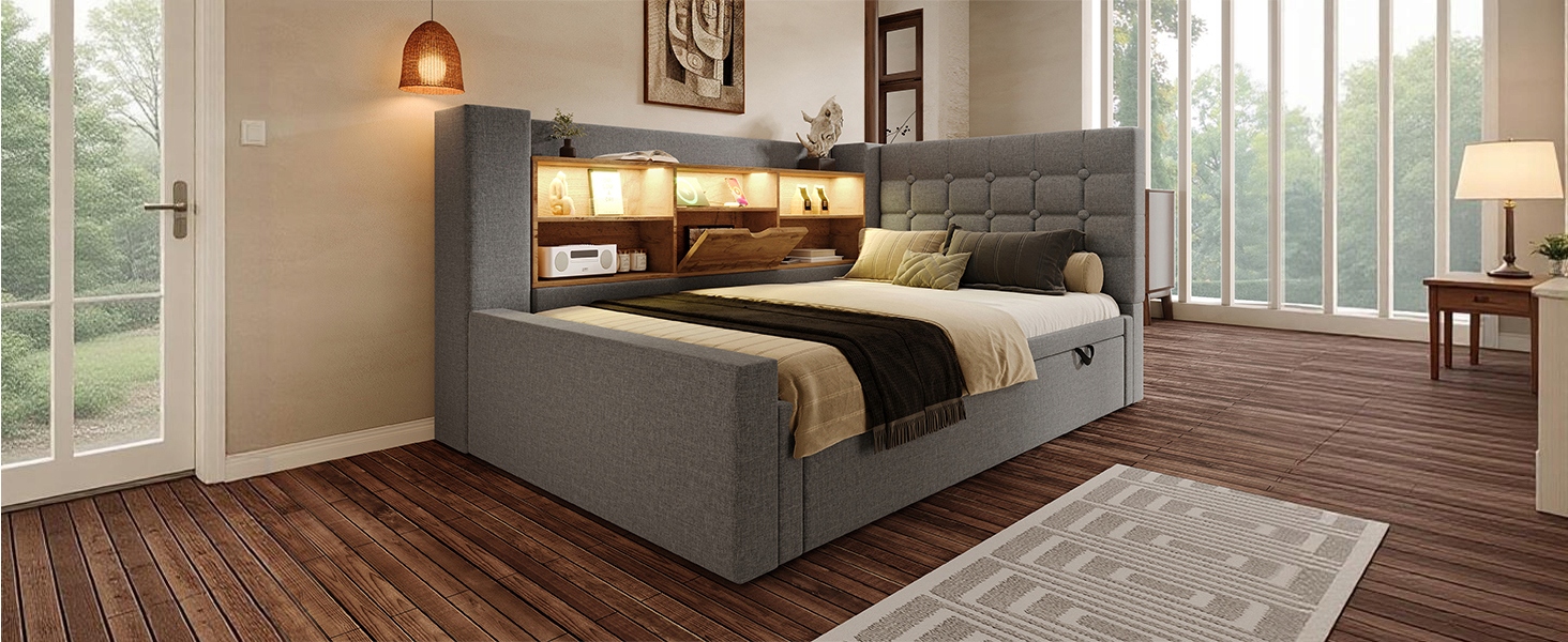 Натхненний зовнішнім виглядом книжкової полиці, це ліжко поєднує стиль із функціональністю. Має продумане приховане сховище, що пропонує непомітний простір для впорядкування ваших речей, зберігаючи чистий, обтічний вигляд.