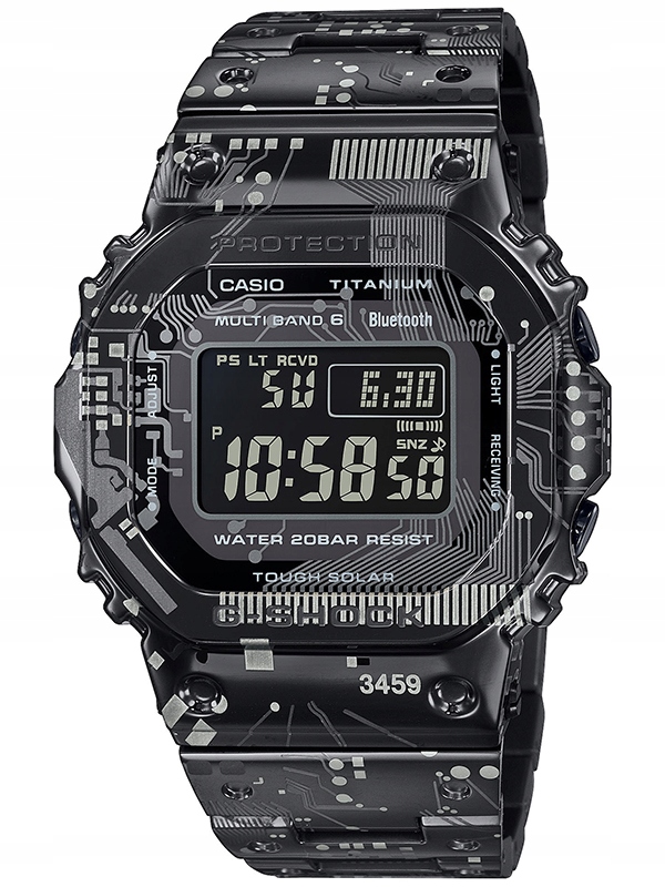 Годинник має модерністський дизайн, який має нагадувати інтегральні схеми. Колір підійде до будь-якого одягу, а малюнок на ремінці та конверті приверне увагу. Годинник G-SHOCK GMW-B5000TCC-1ER відрізняється титановим корпусом і браслетом, а також корпусом з покриттям IP, яке запобігає появі подряпин. Циферблат годинника G-SHOCK GMW-B5000TCC-1ER має цифровий дисплей і покритий сапфіровим склом. Ви можете встановити режим, в якому ви хочете зчитувати час - 24 або 12 годин. Ви можете зчитувати час вночі завдяки підсвічуванню Super Illuminator. Ремінець годинника має спеціальну безпечну застібку, яка запобігає випадковому розстібанню годинника.