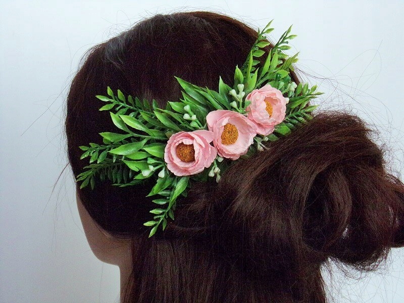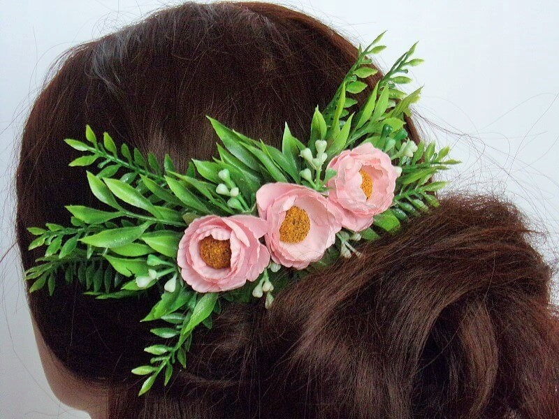 Гребінець виготовлений з декоративних квітів і зеленого листя.