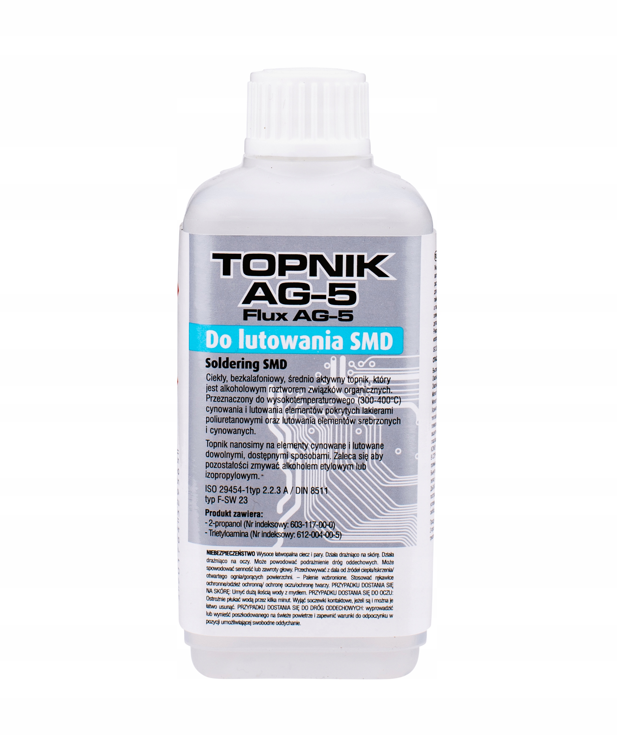 Рідкий середньоактивний флюс без каніфолі типу 2.2.3 А по ISO 9454-1, який є спиртовим розчином органічних сполук. Призначений для високотемпературного (300-400oC) лудіння і паяння елементів, покритих поліуретановими лаками, і паяння посріблених і луджених елементів. Ми наносимо флюс на луджені та паяні елементи будь-якими доступними способами. Залишки рекомендується змити етиловим або ізопропіловим спиртом.