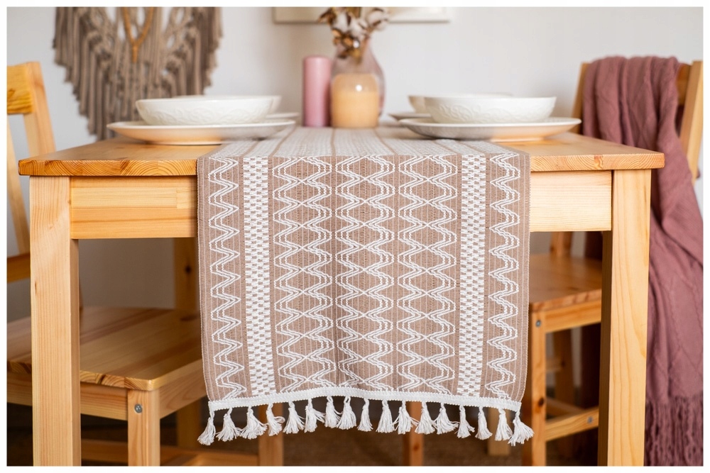 Гачком протектор для столу Boho Rustic Beige з бежевими бахрома 37х180