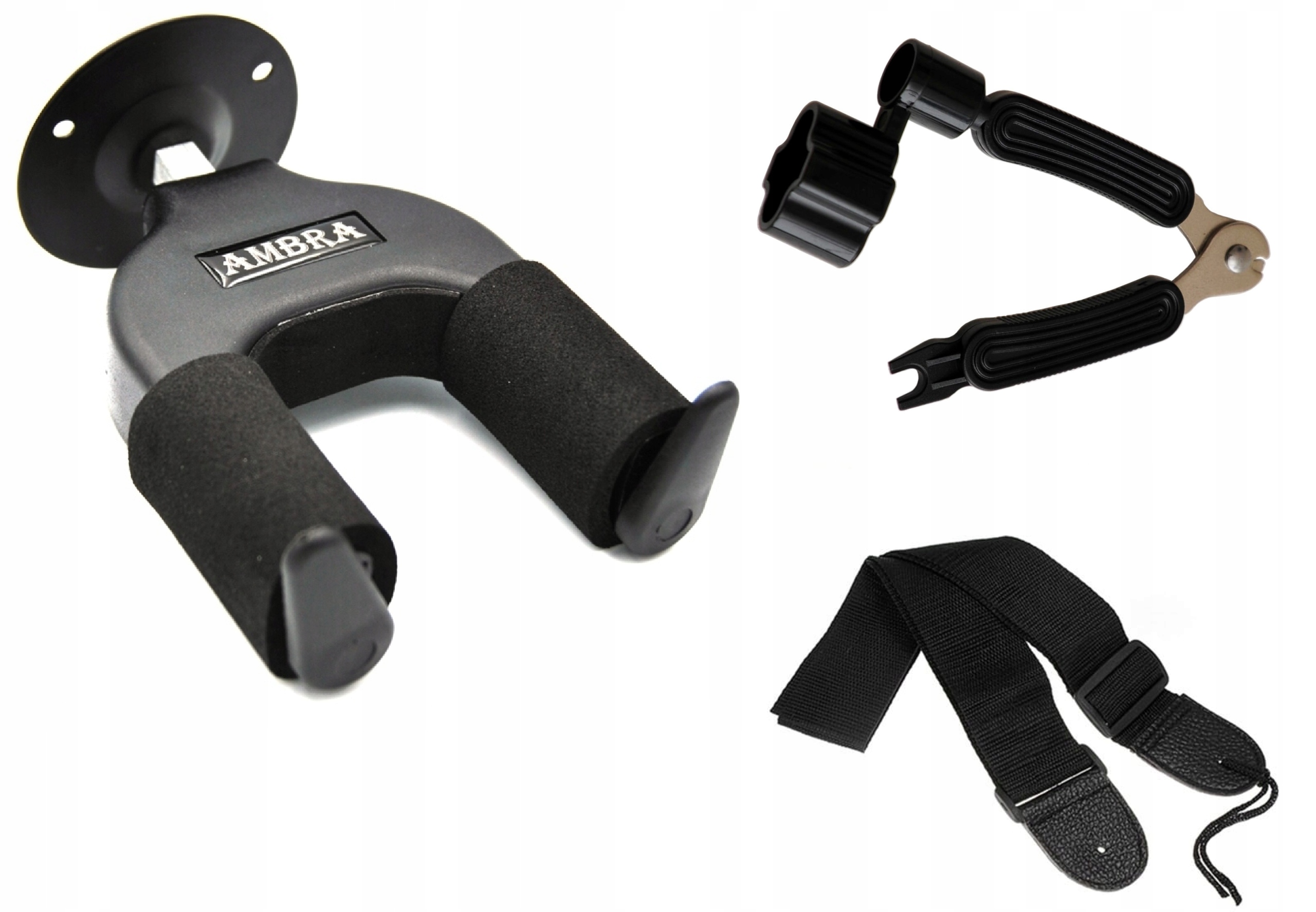 Настінна вішалка для гітари з трьома штекерами (входять в комплект), дуже естетично виготовлена з міцного пластику в поєднанні з металевим гачком. Місця контакту з гітарою покриті м'якою поліуретановою піною для захисту інструменту від стирання. Вішалка дуже зручна і універсальна, підходить практично для всіх типів гітар, мандолін, банджо і т.д.