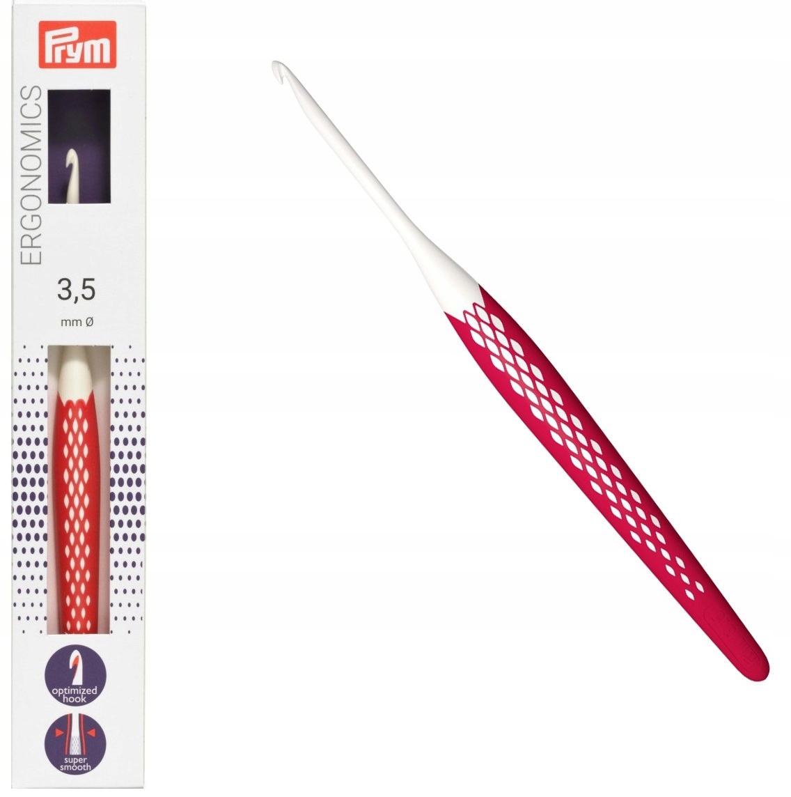 Довжина гачка становить приблизно 16 см, а гачок шириною 3,5 мм. Гачки для в’язання Prym Ergonomics мають різні кольори ручок залежно від товщини, тому їх легко розрізнити.
