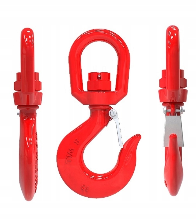 Гак з поворотною ланкою поворотного типу, , що забезпечує вільне обертання навколо своєї осі з можливістю компенсації поздовжнього люфту шляхом з'єднання гака з вертлюгом із зубчатою гайкою та розпірним штифтом. Гак виготовлено з штампованої легованої сталі класу міцності 8. Гачок має пружинну засувку, яка запобігає від’єднанню мотузки або іншої нитки під навантаженням, завдяки чому він надзвичайно безпечний у використанні. p>