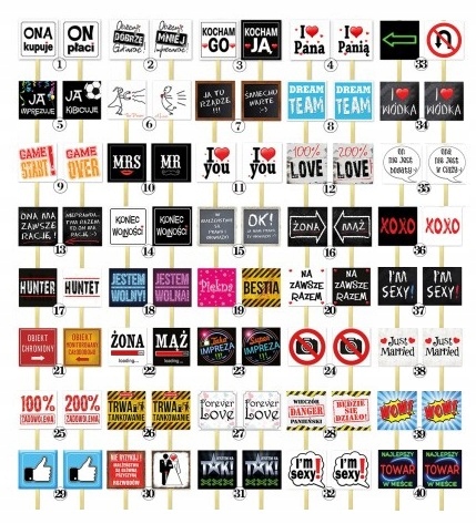 Для всіх клієнтів, які не хочуть витрачати багато грошей на фотозону, ми пропонуємо наш набір, що складається з 26 елементів, включаючи знаки, окуляри, вуса, пов’язки, намисто тощо З його допомогою гості зможуть зробити веселі фото, які стануть чудовим сувеніром про захід