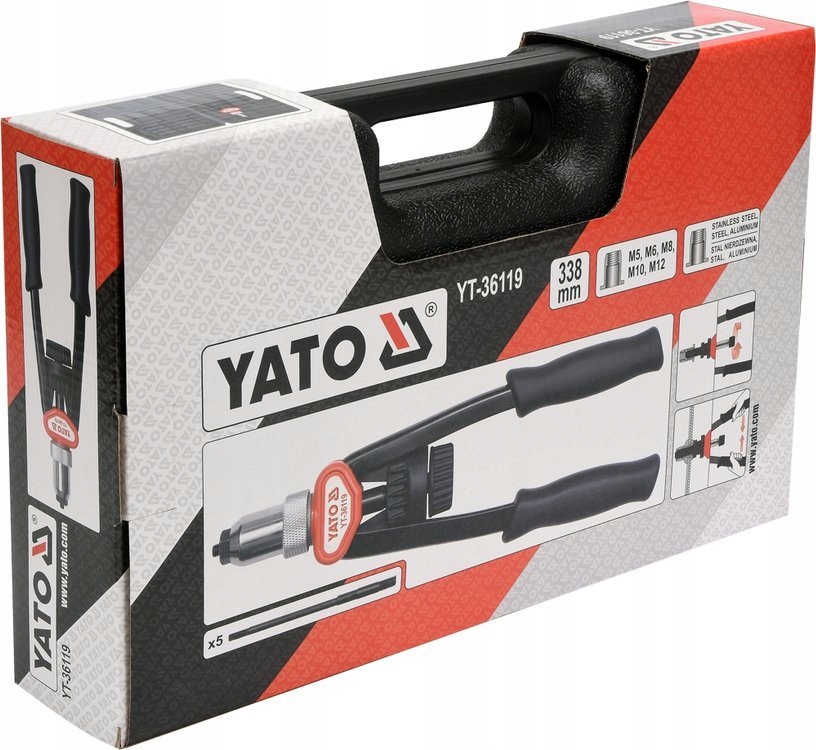 Заклепувальник, призначений для з’єднання матеріалів за допомогою заклепувальних гайок. Ручки з вуглецевої сталі, корпус з алюмінію /ADC12/, робоча головка і тяговий штифт з хромованої сталі з маркуванням 40Cr.