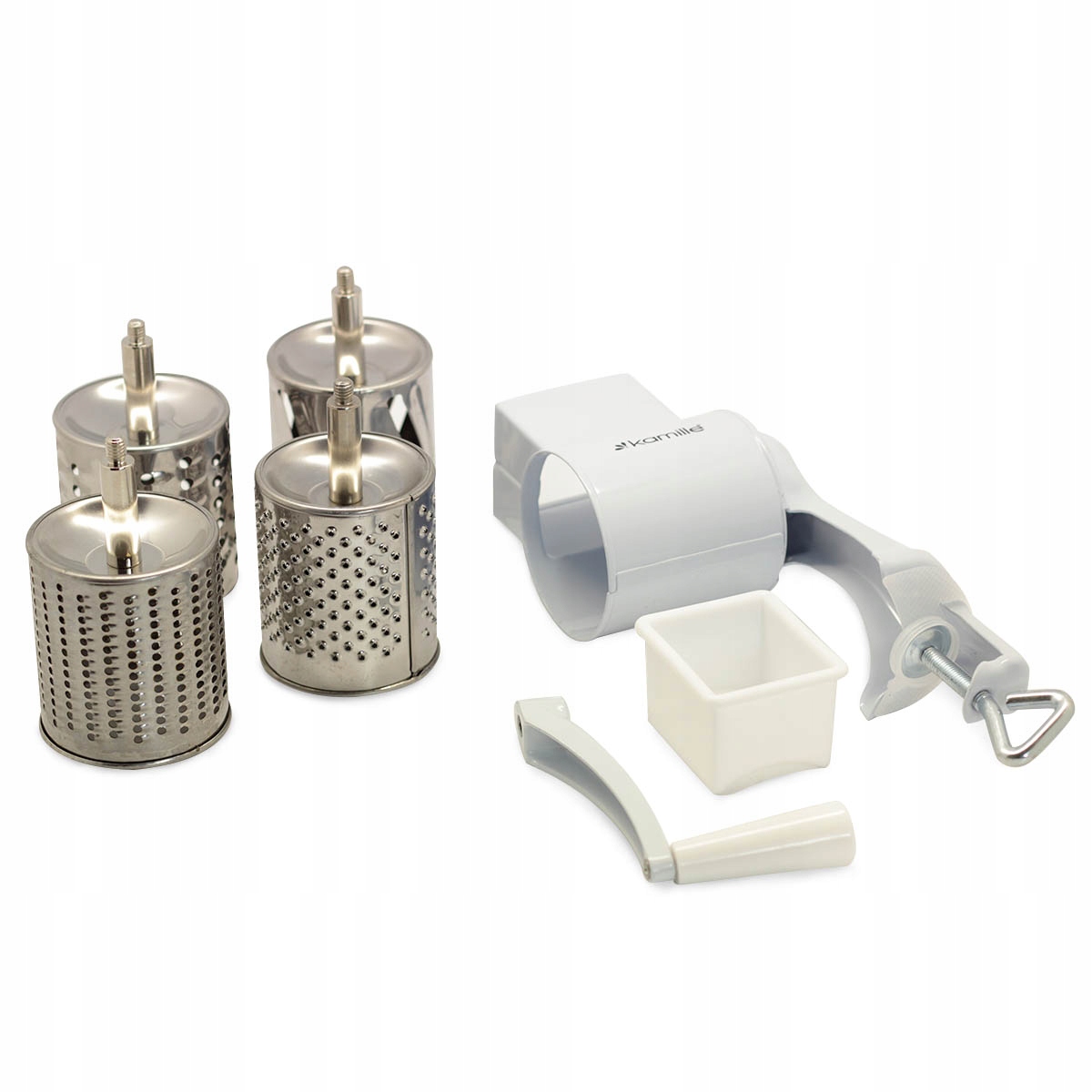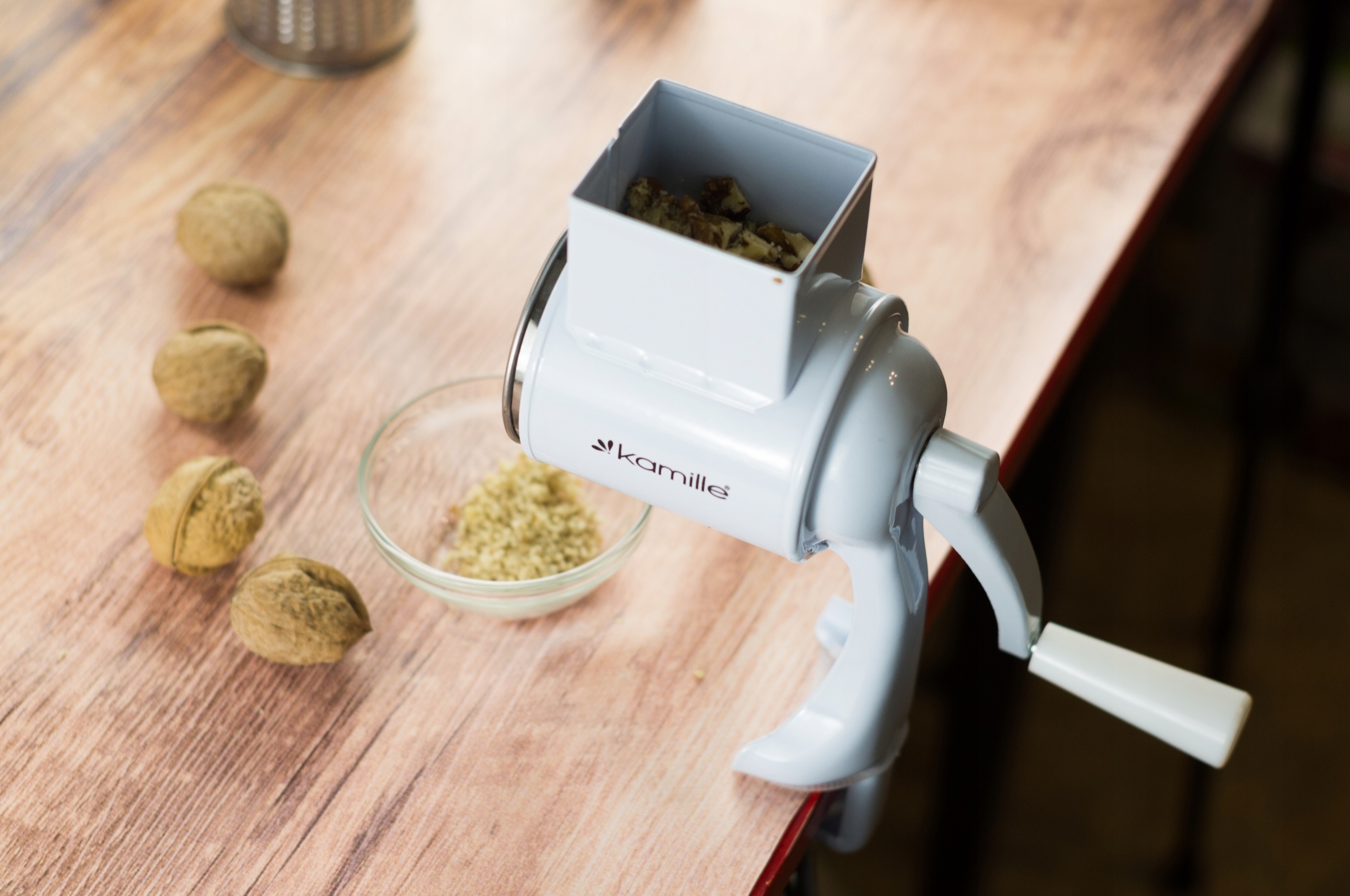 ручна шліфувальна машина kamille виготовлена з високоякісної порошкової сталі. Ідеально підходить для подрібнення горіхів, для тертя сиру, шоколаду або для приготування сухарів. Усі металеві елементи виготовлені з нержавіючої сталі. Він має пороку, що гарантує стабілізацію пристрою на роботі.