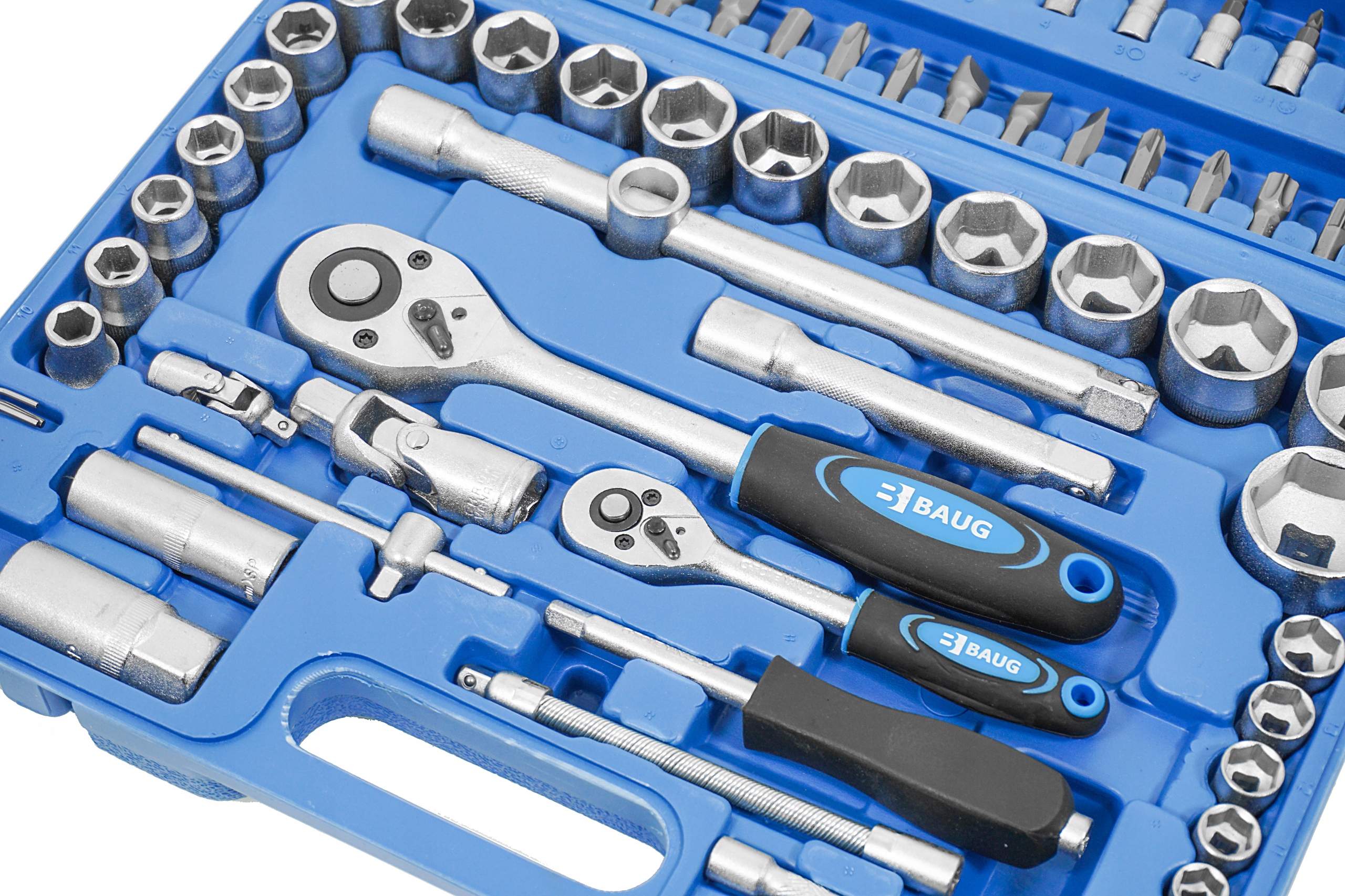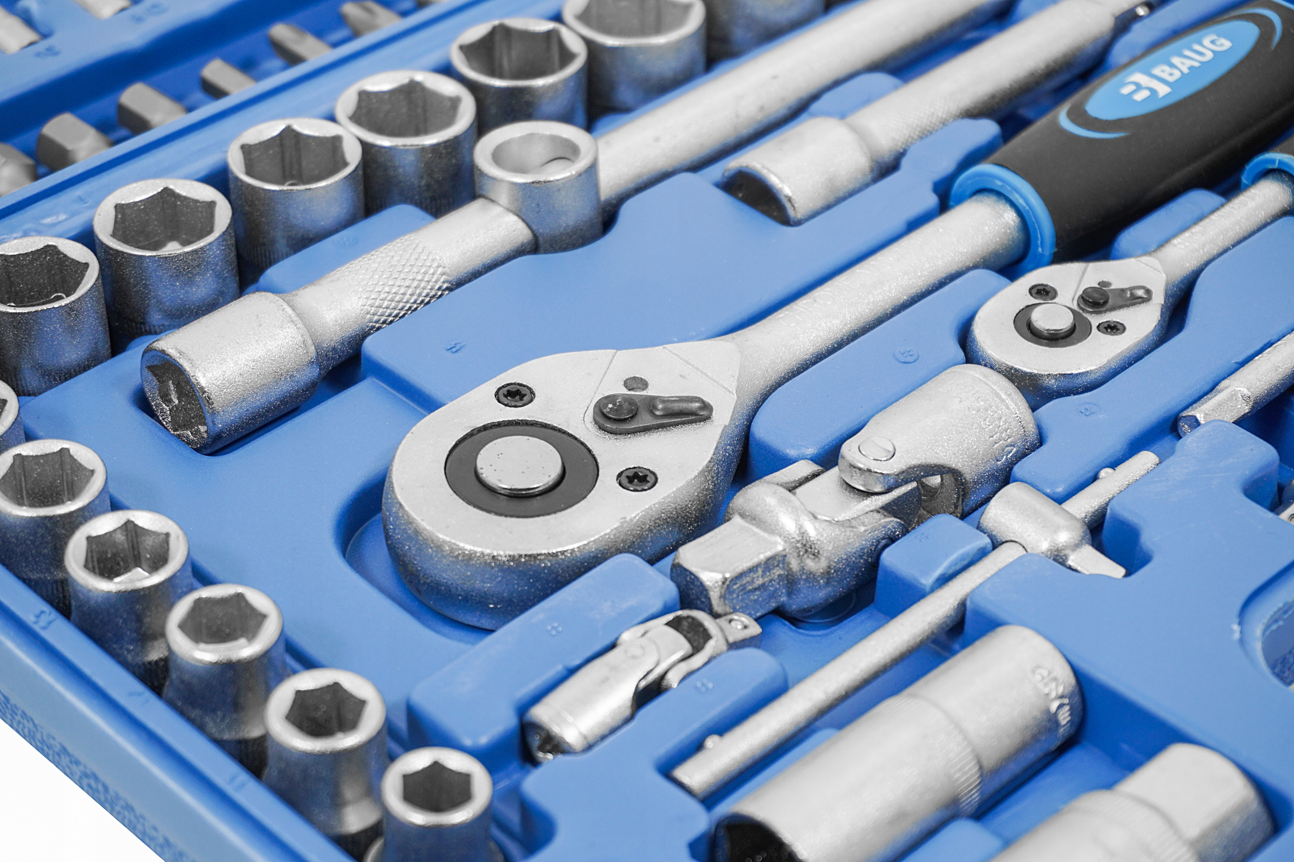 На відміну від дешевих наборів ключів, елементи в наборі BAUG не випадають зі своїх місць, а застібки міцно утримують складену валізу та запобігають її випадковому відкриванню, напр багажник.