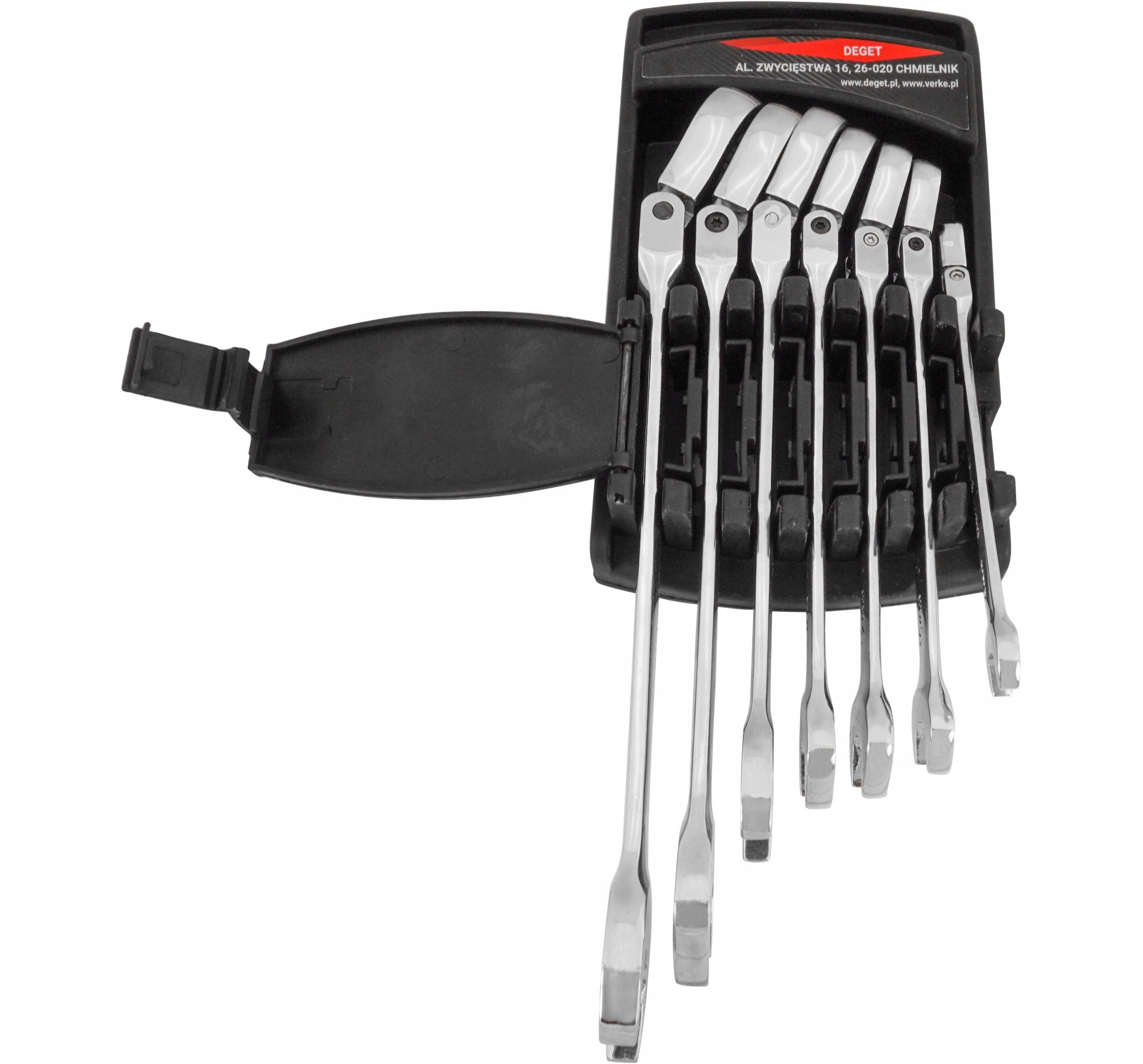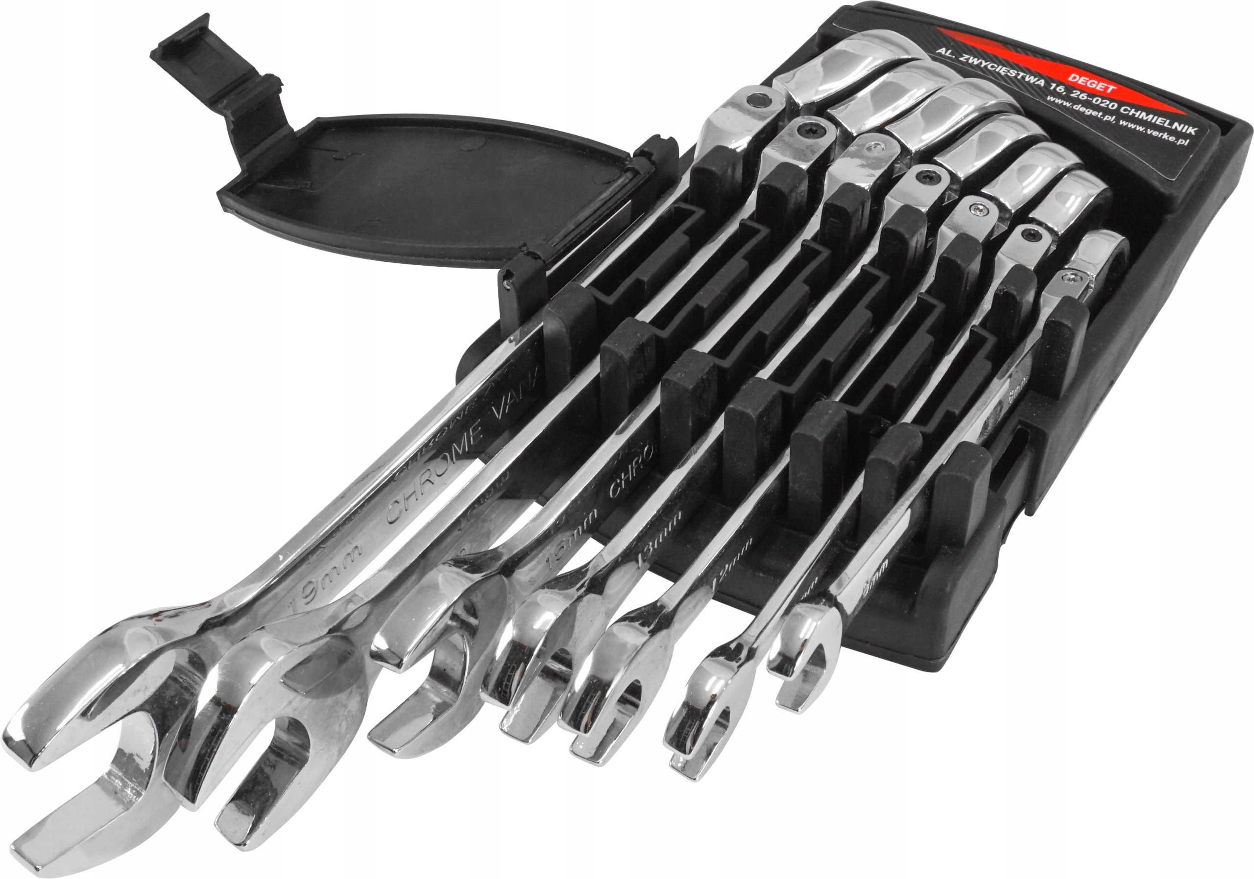 - Набір із 7 зламаних гайкових ключів із тріскачкою: Розміри ключів: 8 мм, 10 мм, 12 мм, 13 мм, 14 мм, 17 мм, 19 мм