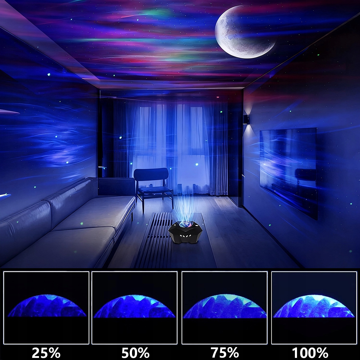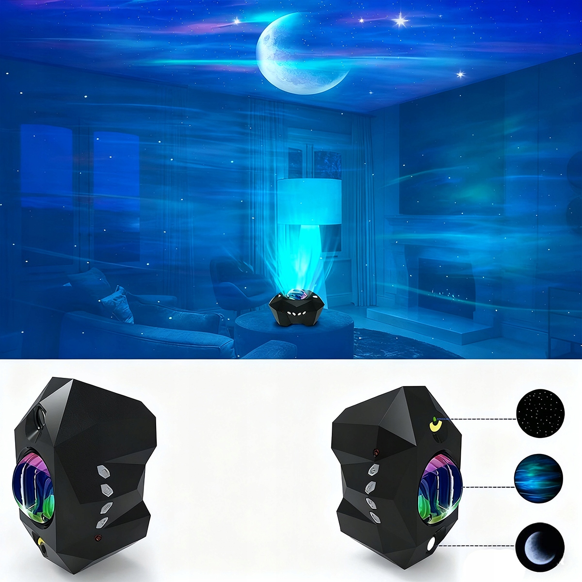 Наш проектор має дуже унікальний і красивий ефект північного сяйва та місяця. Зробіть так, щоб ваша кімната виділялася унікальним краєвидом і відпочивала, наче ви лежали під скандинавським небом!