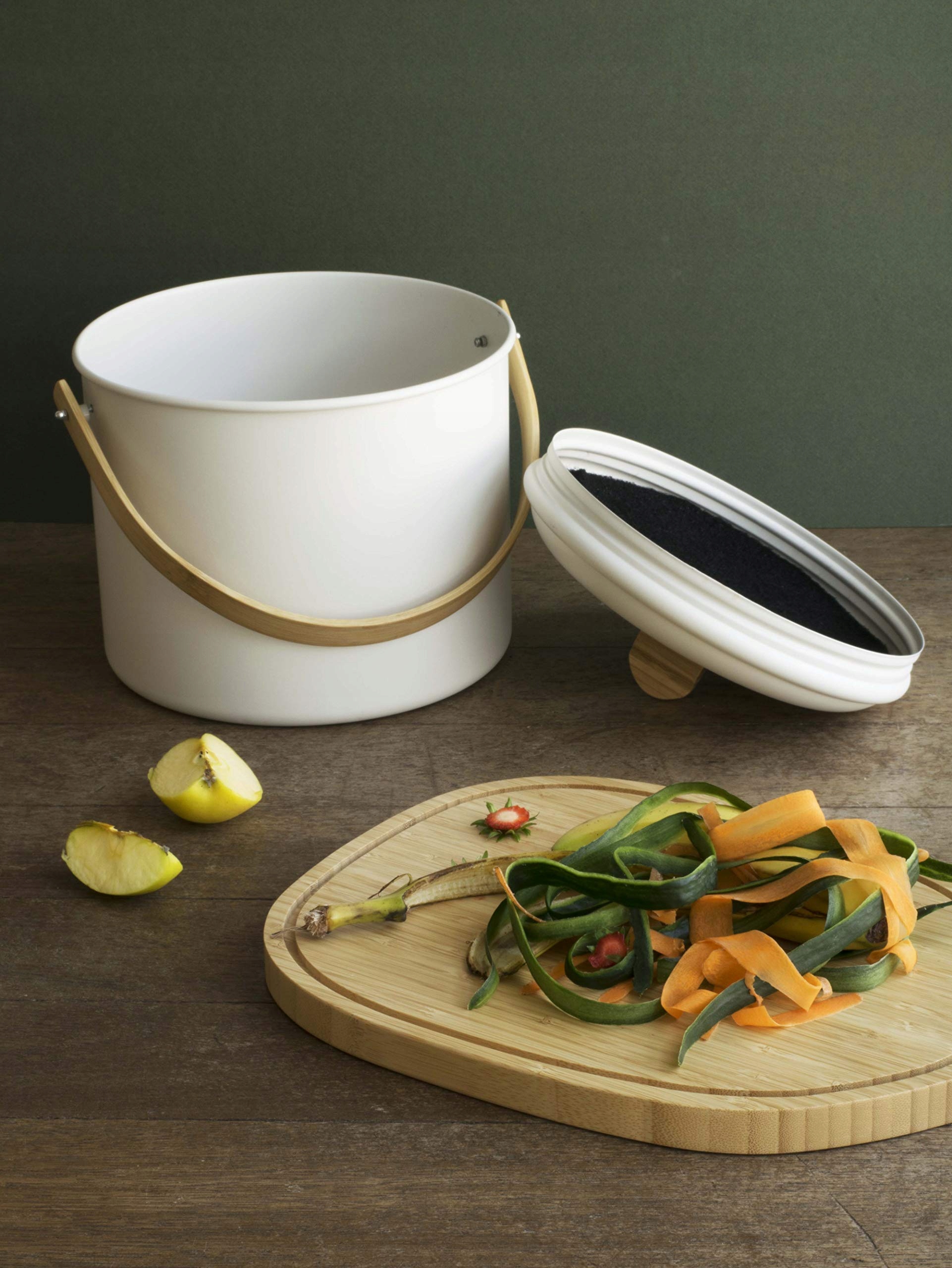 контейнер для компосту в кремовому кольорі, легкий, міцний і простий у використанні однією рукою завдяки ручці бамбука. Висока ємність уникає частого відвідування компостера. Проста та чиста форма та природні матеріали вписуються в будь -який інтер’єр.