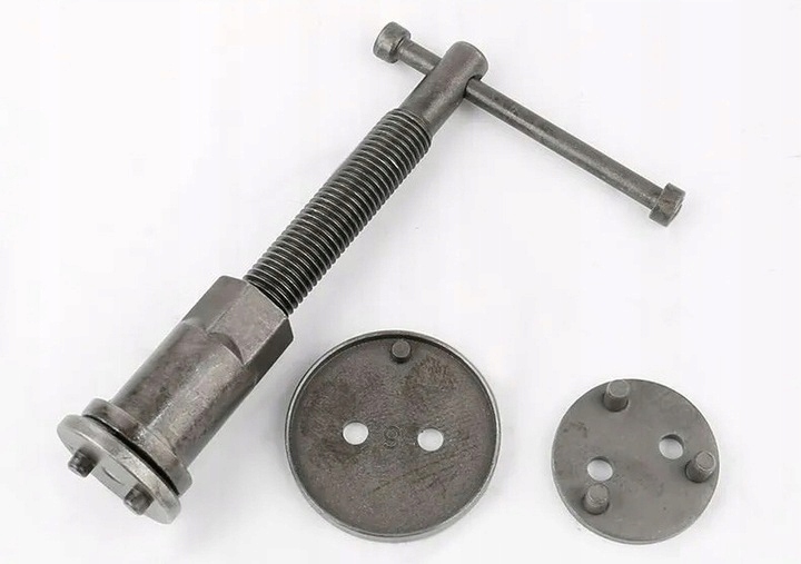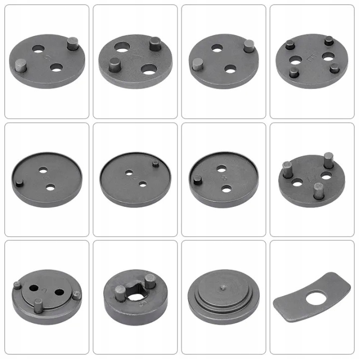 Професійний набір з 13 предметів для реверсування/натискання поршнів у циліндрах гальмівної системи, необхідний при ремонті автомобілів, обладнаних дисковими гальмами. Ручка оснащена магнітним наконечником, завдяки якому вона утримує на осі пластину, відповідну даному поршню. Набір призначений для кожної автомайстерні, де він допомагає прискорити обслуговування гальмівних систем.