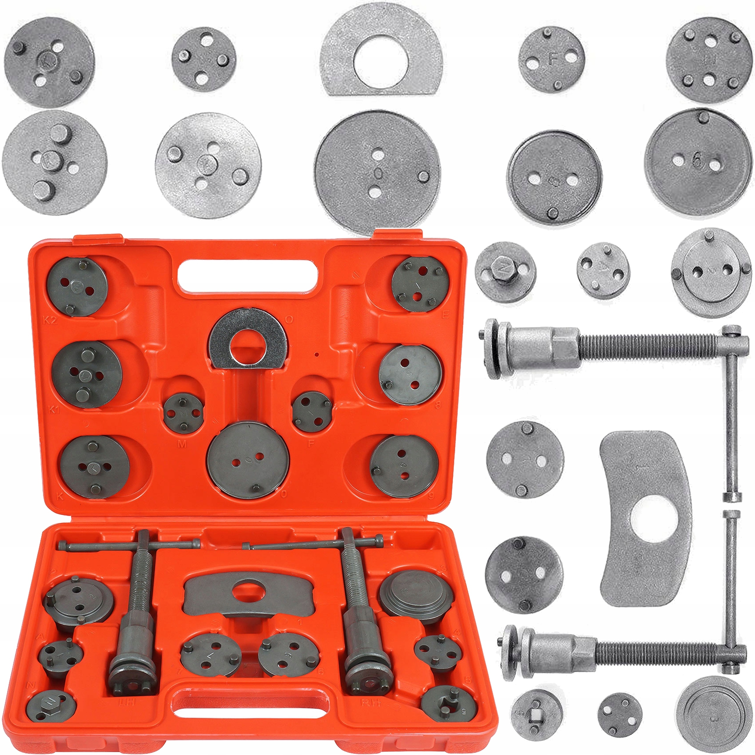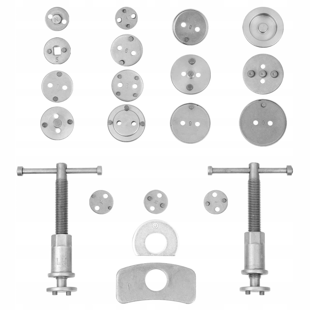 Професійний 21 елемент обертового/пресування поршня в циліндрах гальмівної системи, необхідний для ремонту транспортних засобів, оснащених дисками гальм. Ручка оснащена магнітним кінчиком, завдяки якій вона підтримує тарілку, яка відповідає заданому поршню на осі. Набір призначений для кожного автомобіля, де він допомагає прискорити послугу гальмівних систем.