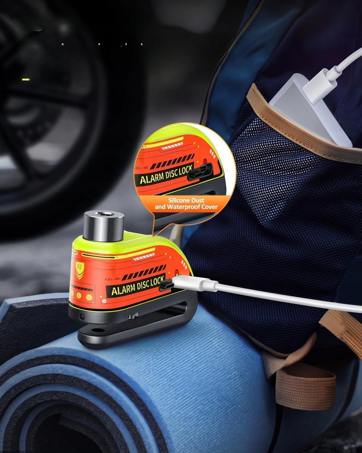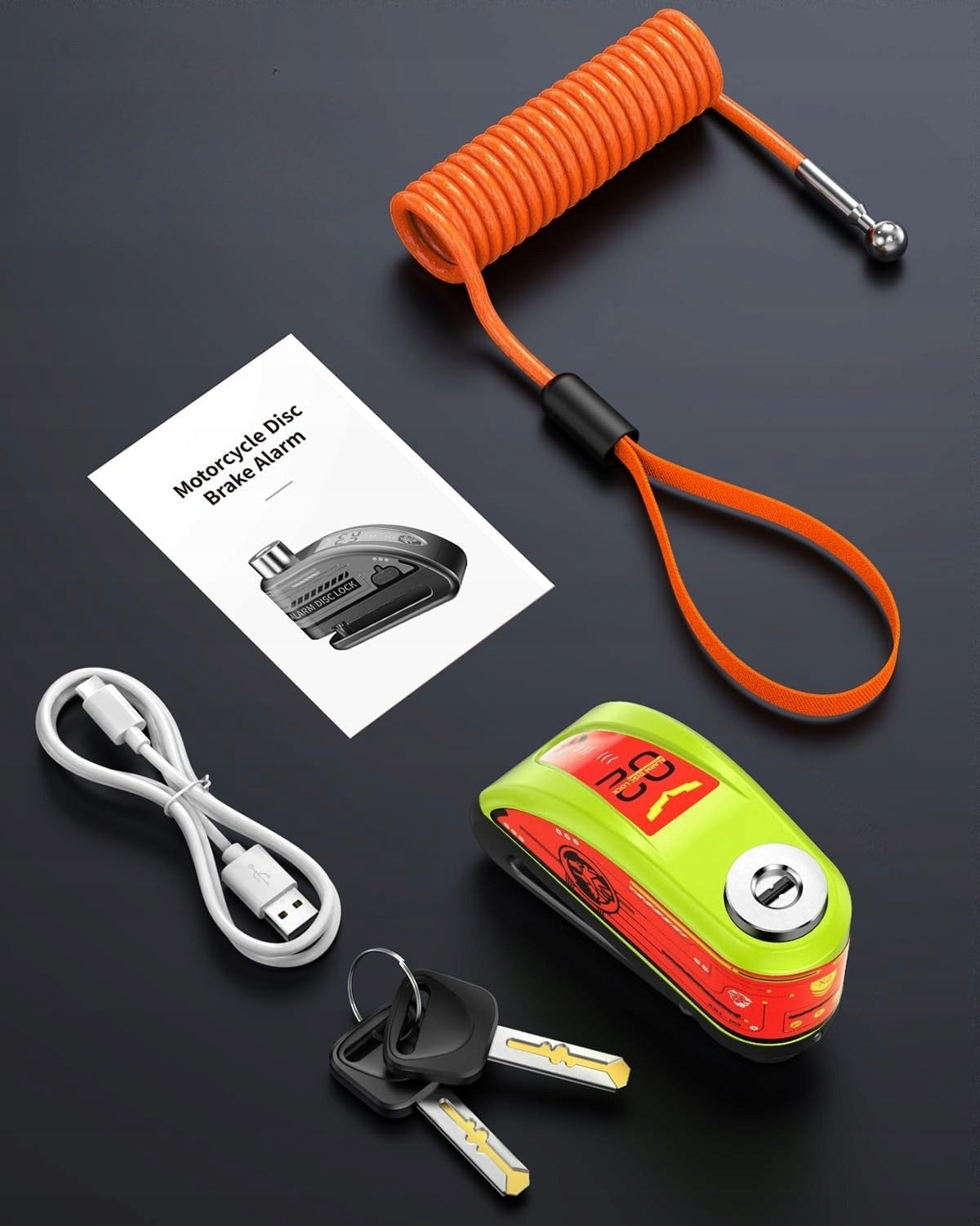 Цей замок із акумуляторним гальмівним диском є найкращим захистом для вашого мотоцикла, скутера, велосипеда чи електровелосипеда. Виготовлений з міцного алюмінієвого сплаву, він стійкий до свердління, пиляння та ударів. Вбудований чутливий датчик запускає гучний сигнал тривоги 120 дБ при найменшому русі, ефективно відлякуючи злодіїв. Крім того, зелений замок оснащений кріпильним кабелем довжиною 1,8 м і має високий клас водонепроникності IP67.