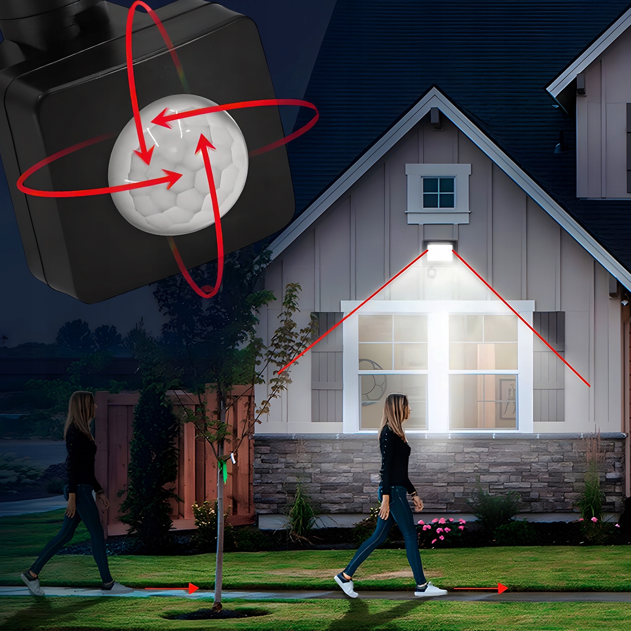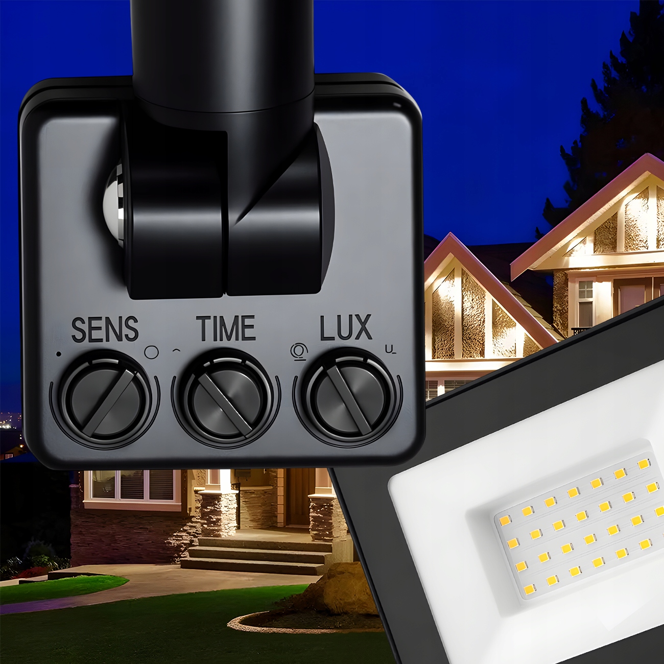 Галогенка оснащена датчиком руху, завдяки якому нам не потрібен вимикач, щоб увімкнути лампу. Чутливість і діапазон датчика можна регулювати за допомогою ручки SENS, розташованої на задній панелі прожектора.