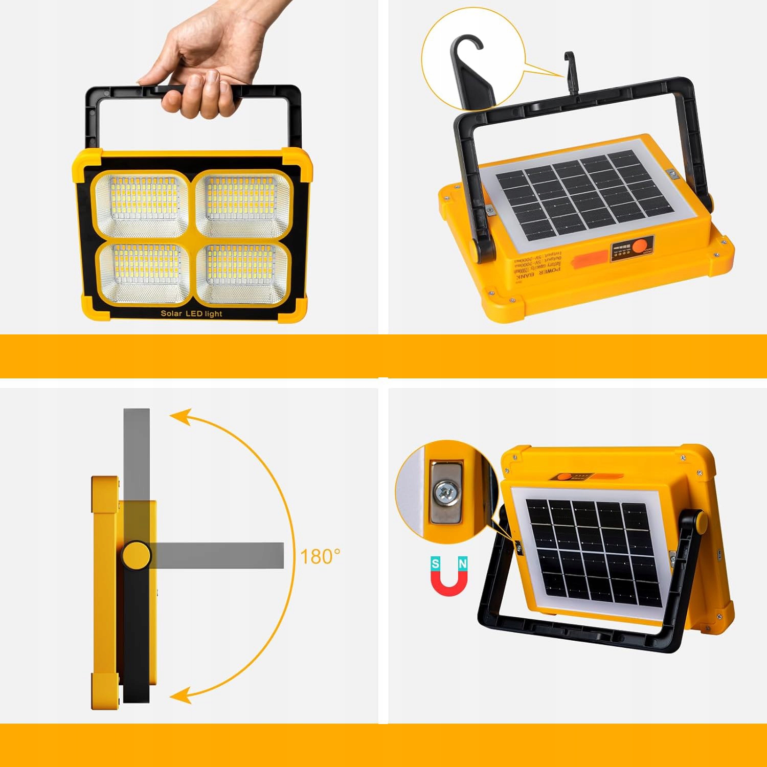 🚨🚨【Портативний і ПІДСТАВНИЙ, РУЧНИЙ і ВІШАЛКА】Завдяки ручці, що обертається на 180°, дизайн світлодіодного прожектора на сонячних батареях можна легко складати або розкладати відповідно до ваших потреб (підставка або ручний). На ручці є прихований гачок, ви можете повернути його та повісити лампу на мотузку.