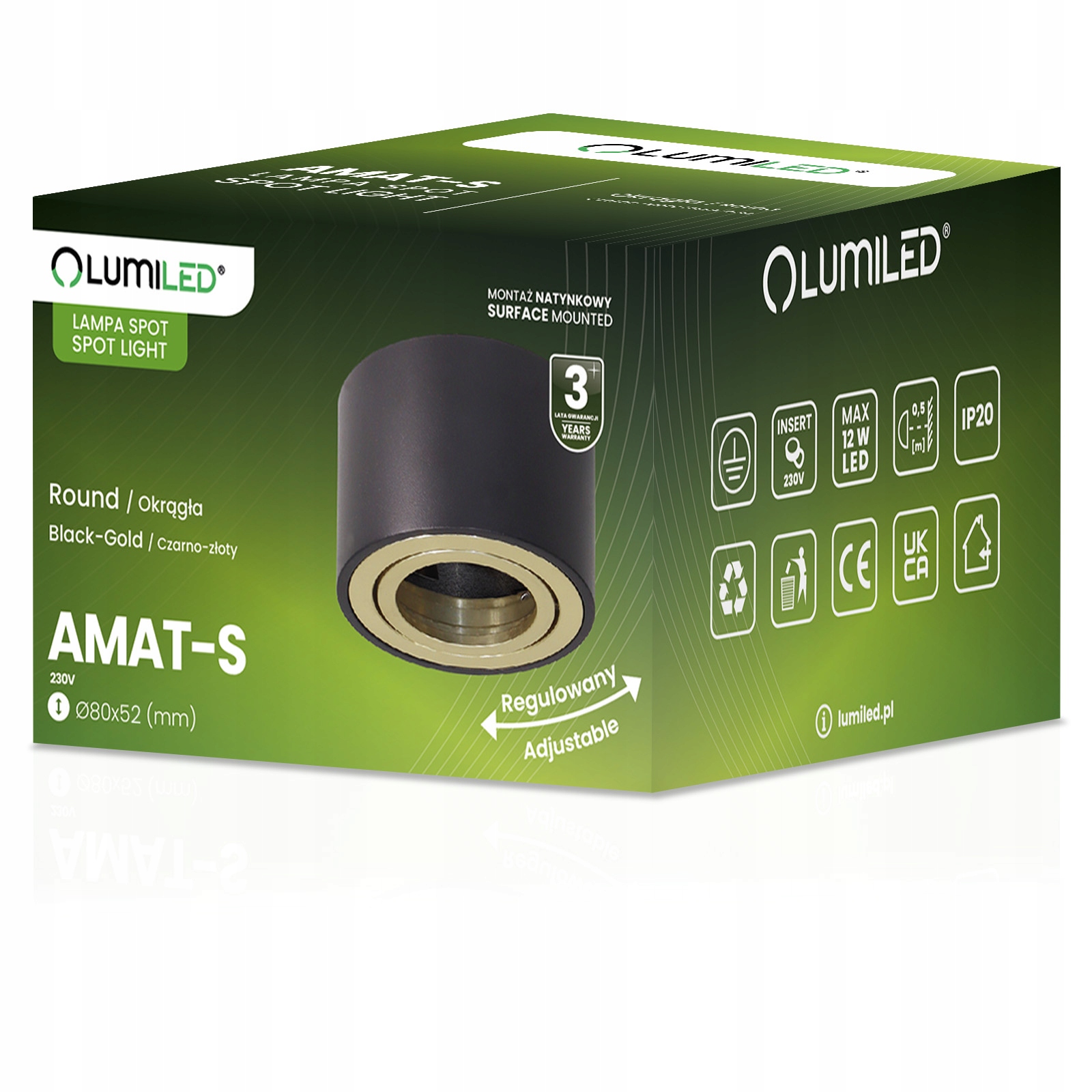 Круглий, рухомий поверхневий світильник чорного та золотого кольору, серія AMAT S, висота 52 мм від LUMILED. Це сучасне джерело світла. Галогенний світильник, встановлений у центральному місці, стане приємною для ока прикрасою, а також ідеальним доповненням до сучасних або мінімалістичних інтер’єрів, додаючи шарму та змінюючи їх зовнішній вигляд.