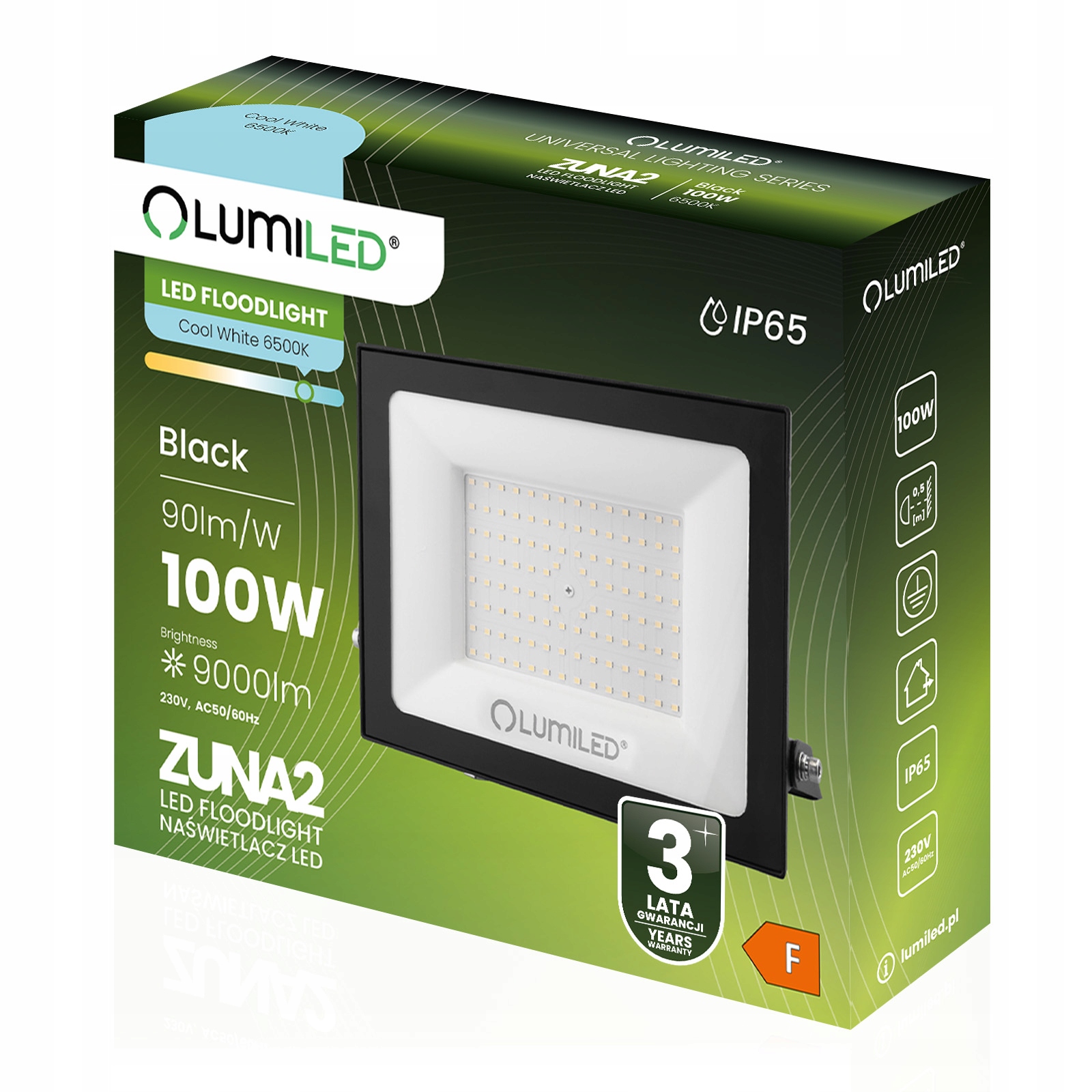 Світлодіодний прожектор ZUNA2 оснащений енергозберігаючим світлодіодним джерелом світла потужністю 100 Вт і Колір холодного світла з колірною температурою 6500K забезпечує освітленість на рівні 9000lm - що дає нам потужність світлового потоку 90 лм/Вт.
