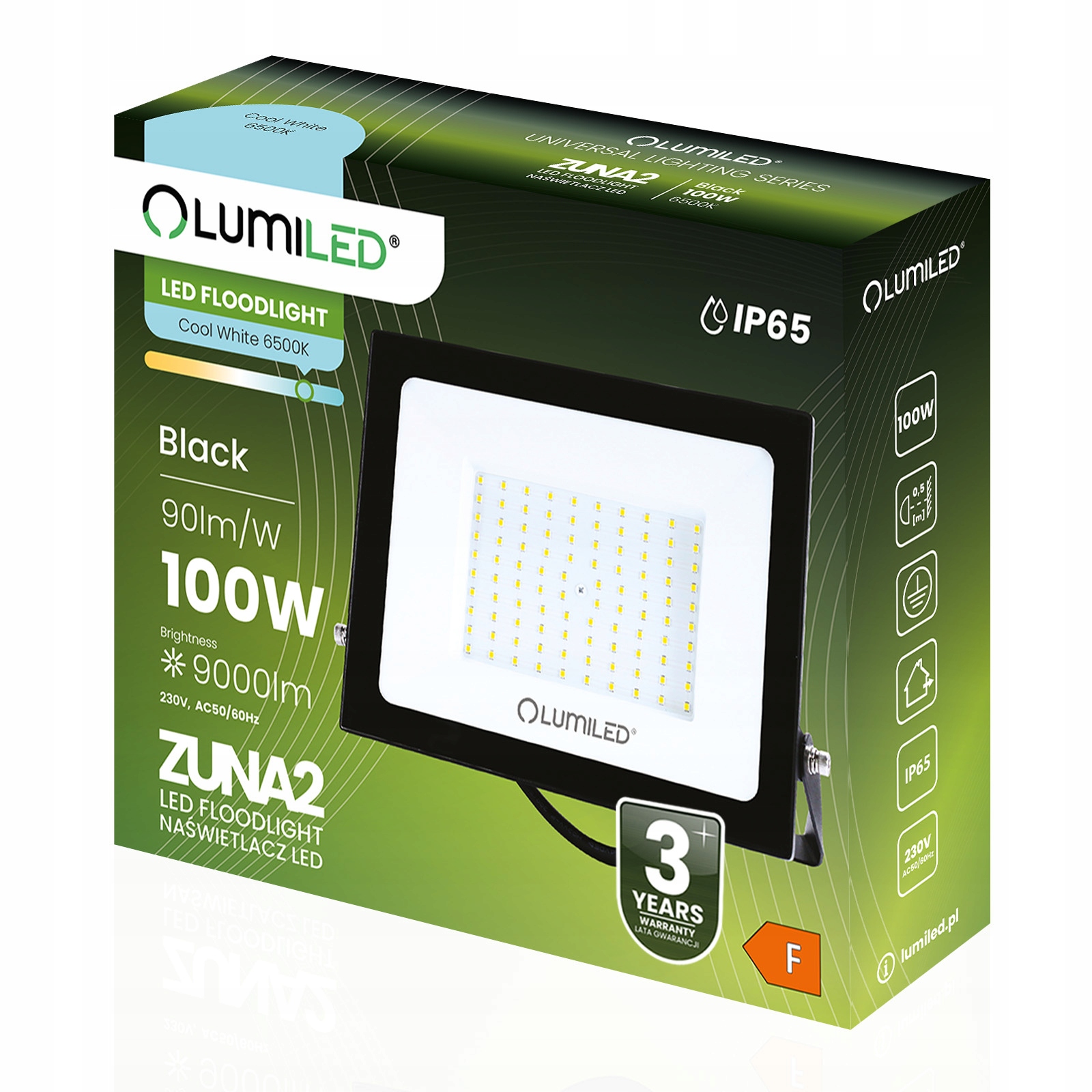 Світлодіодний прожектор ZUNA2 оснащений енергозберігаючим світлодіодним джерелом світла потужністю 100 Вт b> і холодного світла з колірною температурою 6500 К, що дає освітленість на рівні 9000 лм, що дає нам потужність світлового потоку 90 лм/Вт.