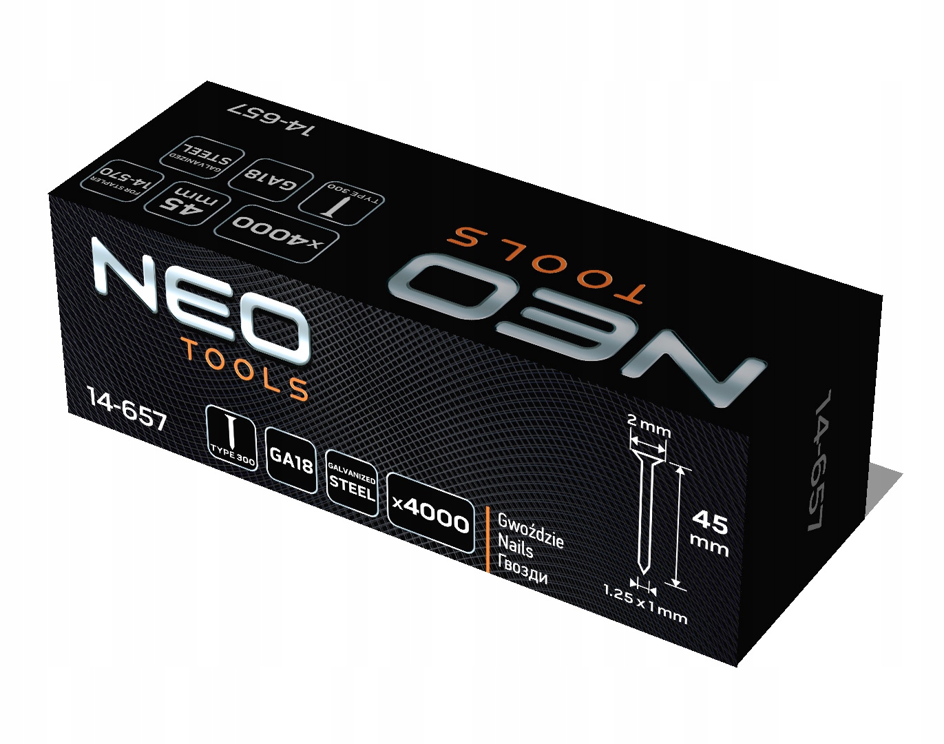 Цвяхи оцинковані для пневматичного степлера (14-570), GA18, тип 300 (F), довжина 45 мм, 4000 шт. 14-657 фірми NEO - це сталеві цвяхи, оцинковані і тому стійкі до корозії. Призначені для пневматичного степлера 14-570 NEO. Характеризуються довжиною 45 мм, тип 300 (F), GA18. Вони пропонуються наборами по 4000 штук. Цвяхи рекомендовані для всіх видів робіт пневматичними степлерами. Вони підійдуть для професійного використання.
