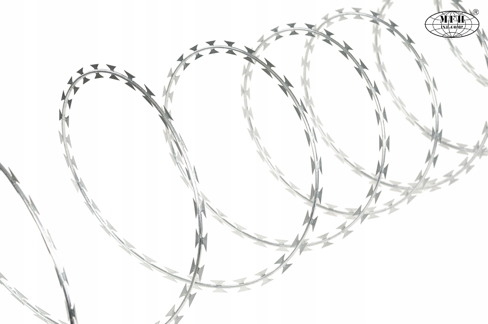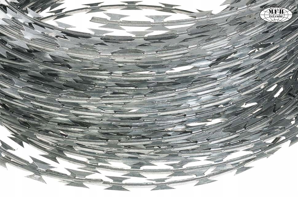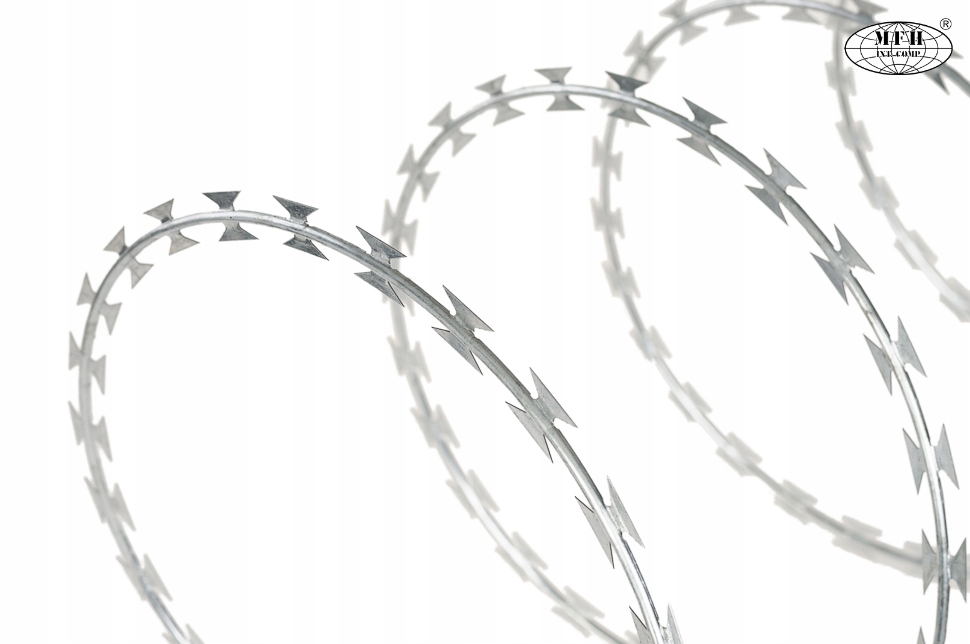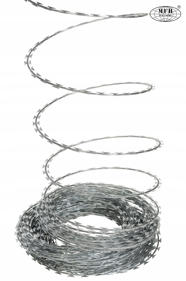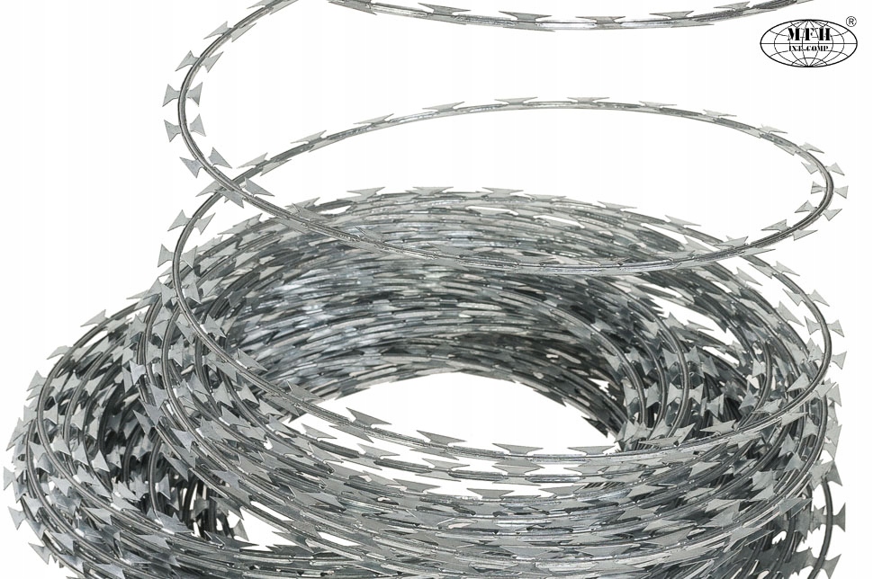 Дріт колючий сучасний, дріт колючий готовий. Продукт німецького бренду MFH Int. Високоякісний продукт, військова специфікація. Використовується для будівництва та кріплення огорож, захисту обладнання, складів, спорудження огорож, контрольно-охоронних постів. Підходить для підвішування на огорожах, естакадах і безпосередньо на будівлях. Дуже гострі та щільно розташовані леза бритви запобігають проходу небажаної людини чи тварини. Спроба протягнути дріт призводить до численних травм, пошкодження одягу або постійного зачеплення.