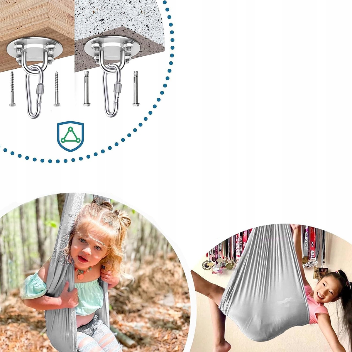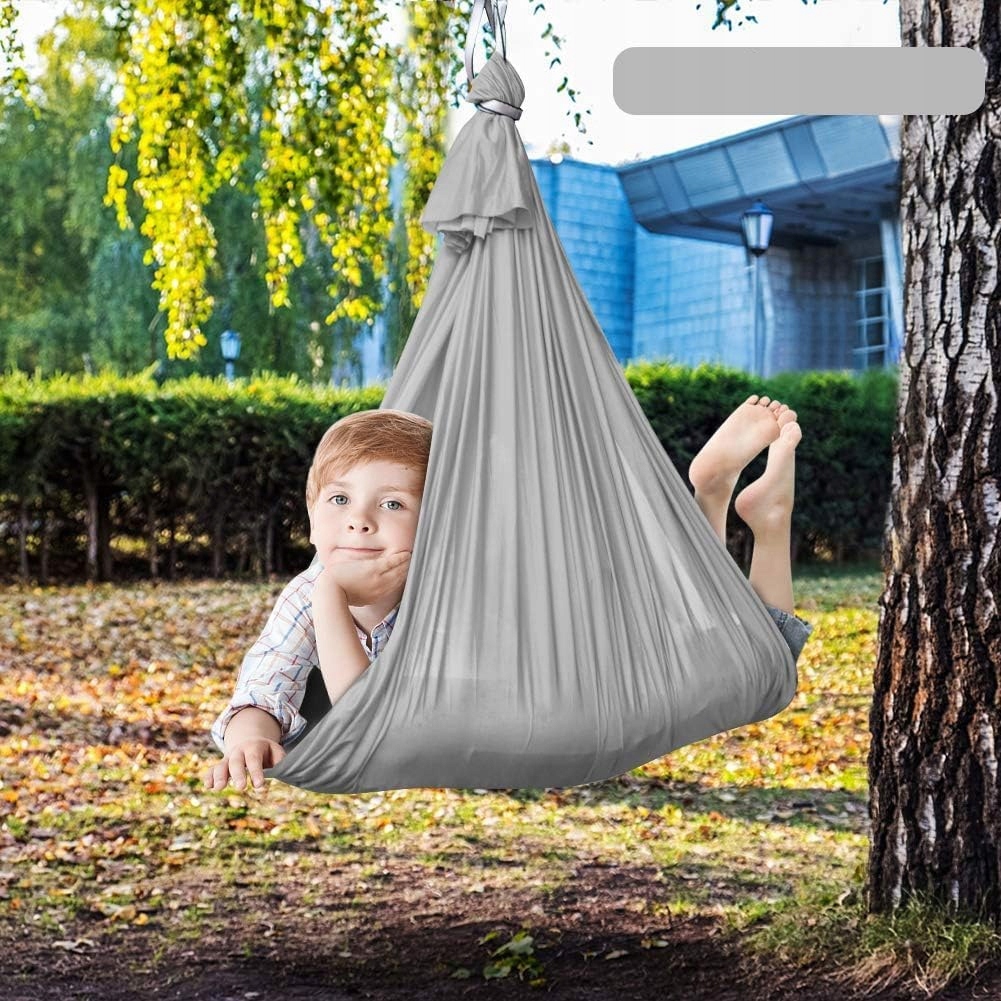 Дитячий гамак-гойдалка виготовлений зі 100% нейлону високої щільності, що робить його легким і стійким до розривів, і має вантажопідйомність до 90 кг (200 фунтів). Надзвичайно м’яка конструкція, що розтягується з боків і не перекочується, полегшує та безпечніше для дітей, щоб грати та відпочивати, коли їм потрібно зняти стрес. Лікувальна гойдалка з тканинною кімнатною гойдалкою дає дітям багато можливостей грати на гойдалках, читати, робити сальто та обертатися.