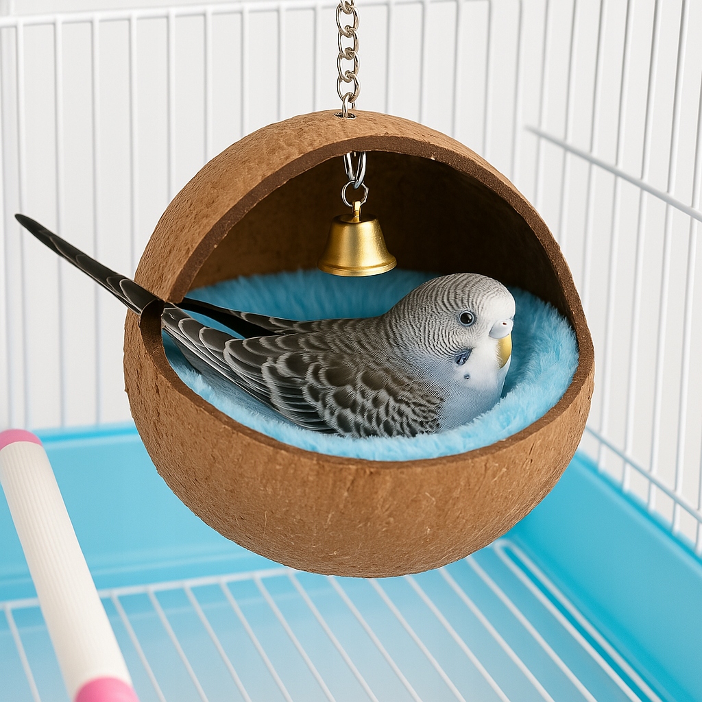 Створіть затишне, безпечне місце, де ваш папуг почуватиметься в раю! Цей чарівний гамак, виготовлений з справжнього кокосового горіха, набитий м'яким, рожевим матеріалом, є ідеальним лігвом для німф, шуму, ялини та інших маленьких папуг.