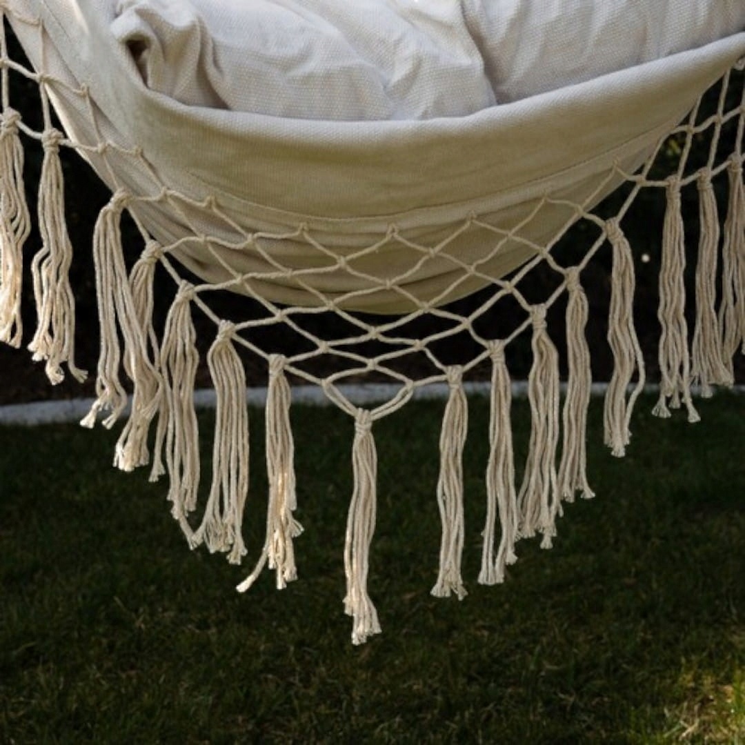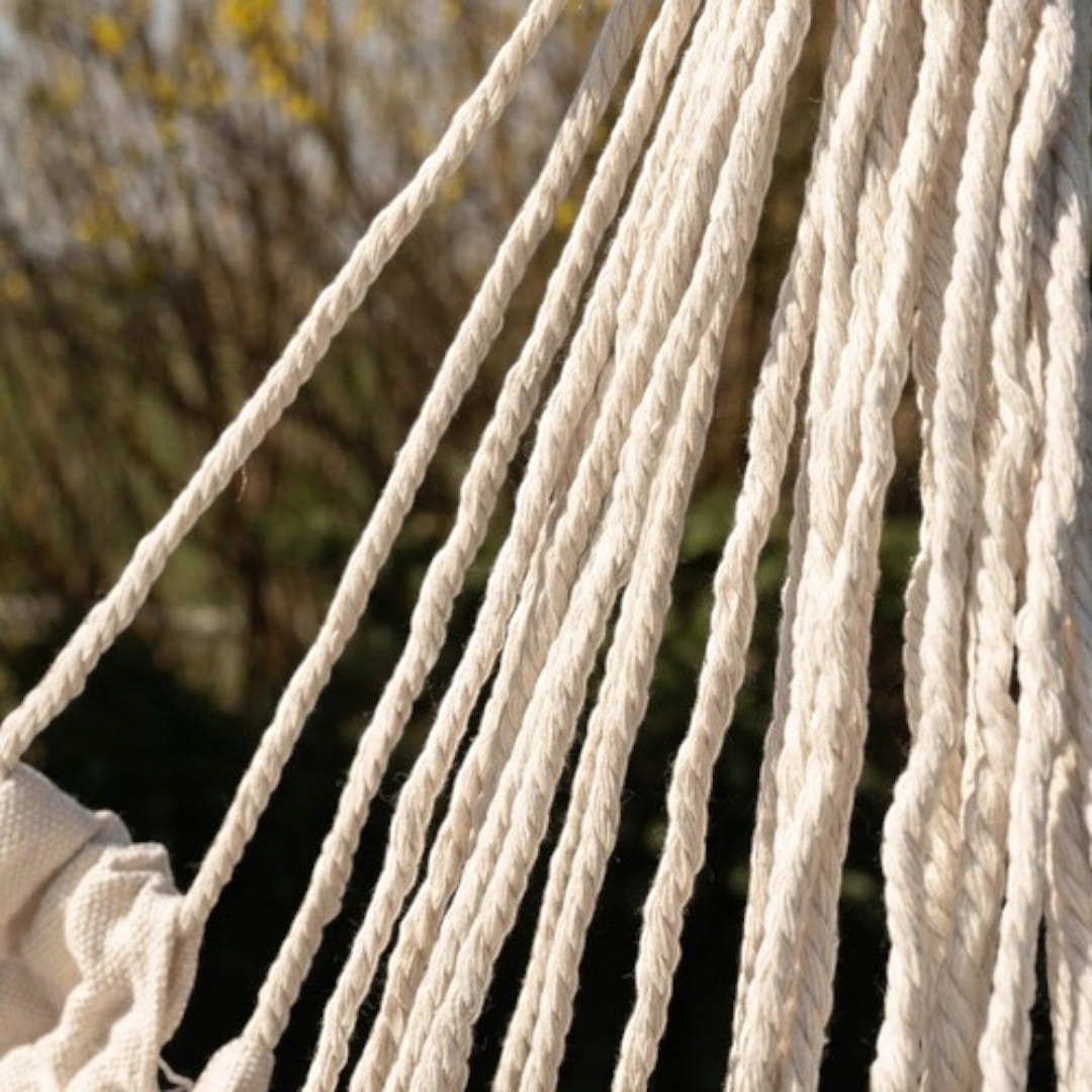 Бежевий бразильський гамак з подушками - це зручне та функціональне підвісне крісло, ідеально підходить для відпочинку в саду, на терасі, балконі чи навіть вдома. Виготовлений з дихаючої бавовни з домішкою поліестеру та оснащеним твердим дерев’яним брусок і м'якими подушками, забезпечує зручний відпочинок та стильний вигляд у кожному просторі.