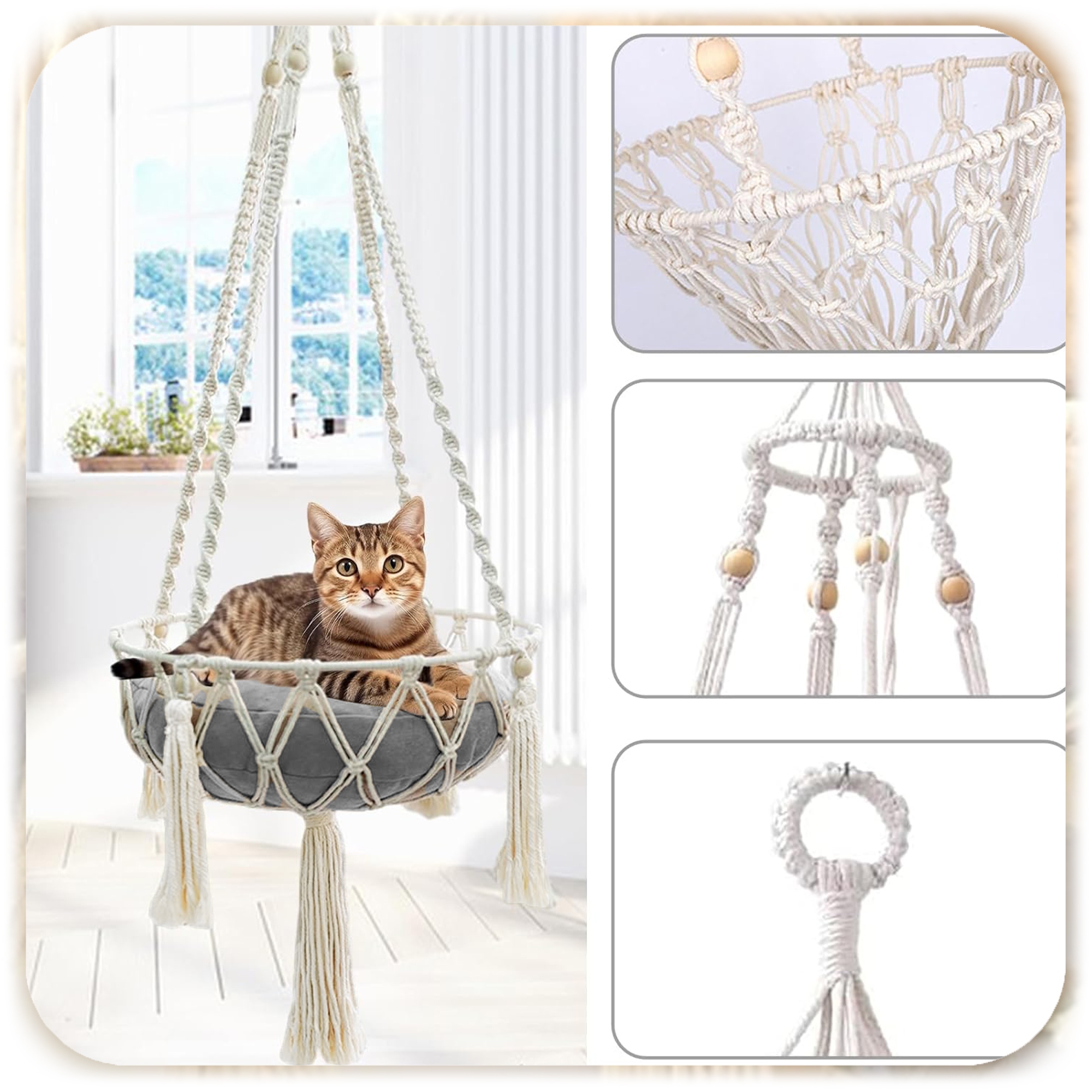 Гамак було виготовлено вручну з міцної плетеної бавовняної нитки. Декоративна бахрома і дерев'яні намистини підкреслюють стиль бохо, завдяки чому ліжко ідеально підходить не тільки як практичне місце відпочинку для кота, але і як елемент декору вдома.