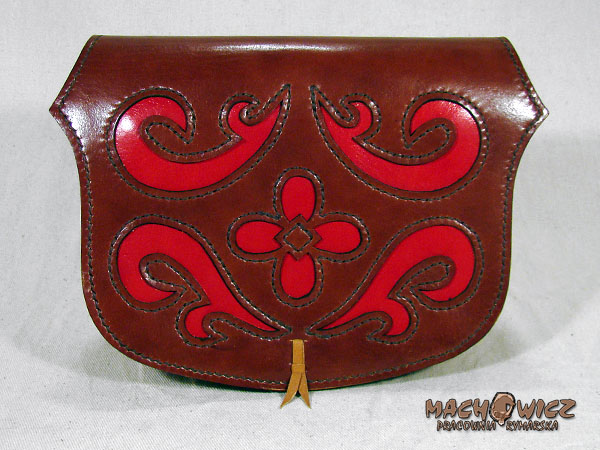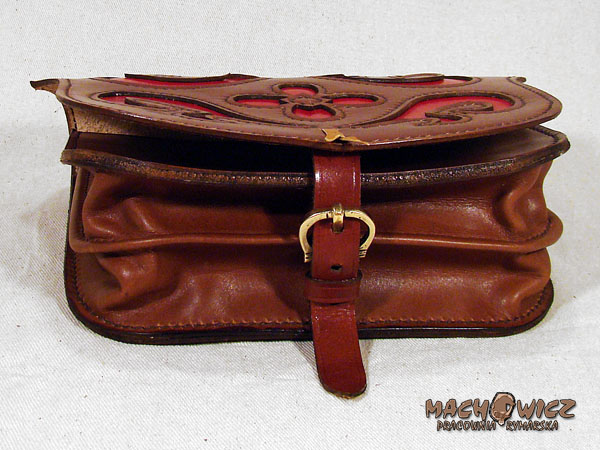 Калета нова. Виготовлений з тонкої фарбованої коричневої шкіри. Має дві кишені глибиною 4 см кожна. Додатково в одній з кишень є третя менша кишеня. Спереду гаманець прикрашений ажурним візерунком (з рослинним мотивом), обшитий шкірою темно-червоного кольору. Все це застібається на історичну латунну пряжку. На спинці куртки пришиті дві шлевки (діаметр шлевки 6 см, ширина 2 см). Куртка пошита вручну, що гарантує її довговічність і не розпускається.