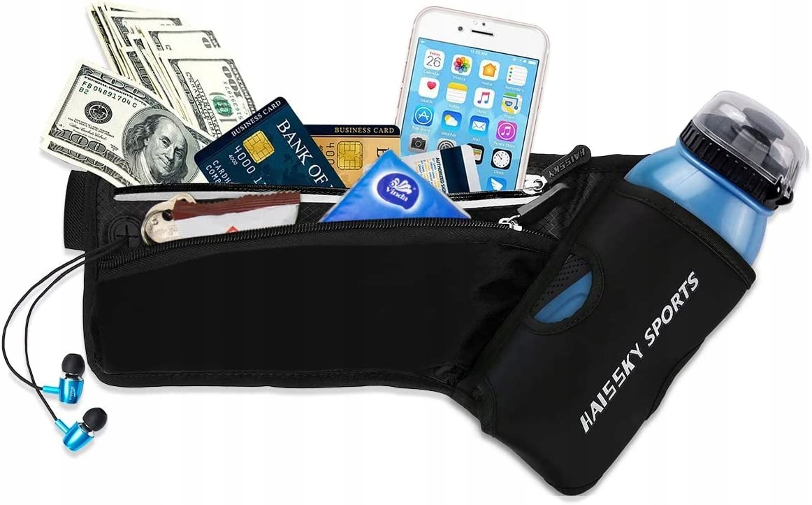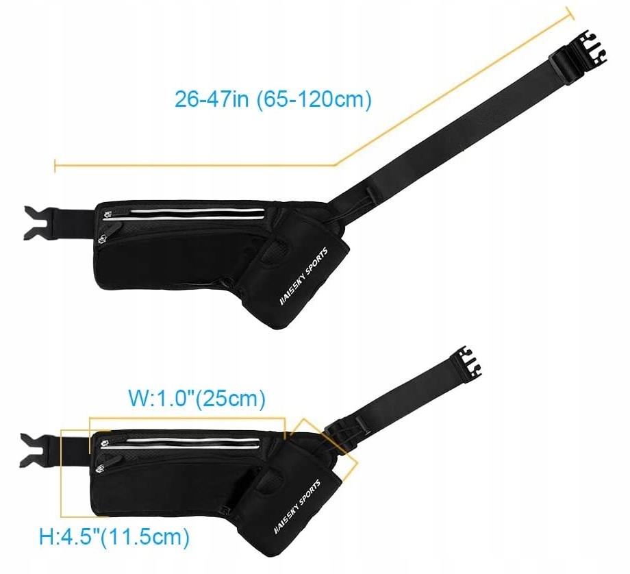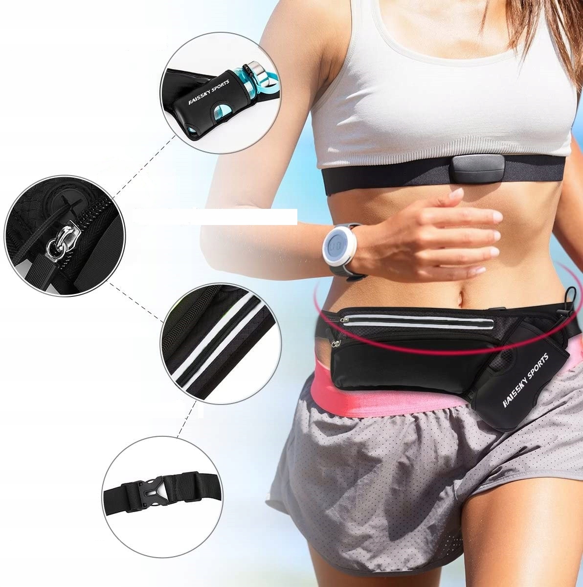 - Багатофункціональність - гнучкий та регульований ремінь має довжину від 65 до 120 см. Два відділення для особистих речей і отвір для навушників. Додатково тримач для кріплення пляшки з водою. Спереду також є світловідбиваючі елементи, які роблять вечірні прогулянки абсолютно безпечними.
