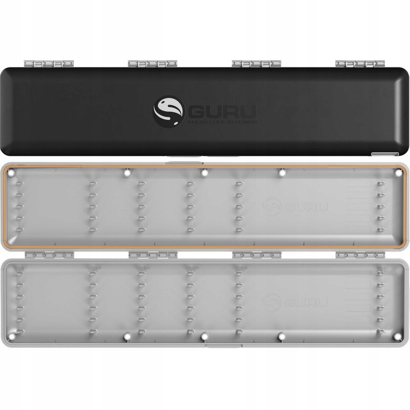 контейнер з подвійним лідером гуру до 38 см завдовжки. Коробка закріплена прокладкою, яка захищає лінії від вологи і закрита магнітами, тому неможливо пошкодити закриття. Етикетки прикріплені до поля, щоб позначити довжину лідерів та їх типу. Довгий контейнер для версії для лідерів довжиною від 6 до 15 дюймів.