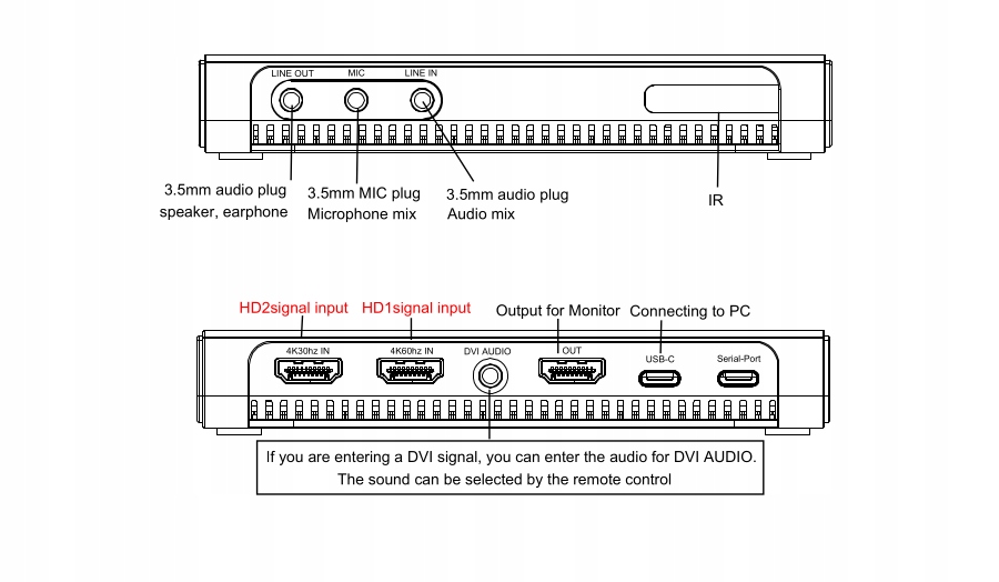 - мікрофонний вхід, лінійний вхід, аудіо DVI, USB тип C (живлення), виходи: HDMI (петля з низькою затримкою), лінійний аудіо, USB тип C (дані),< /li>