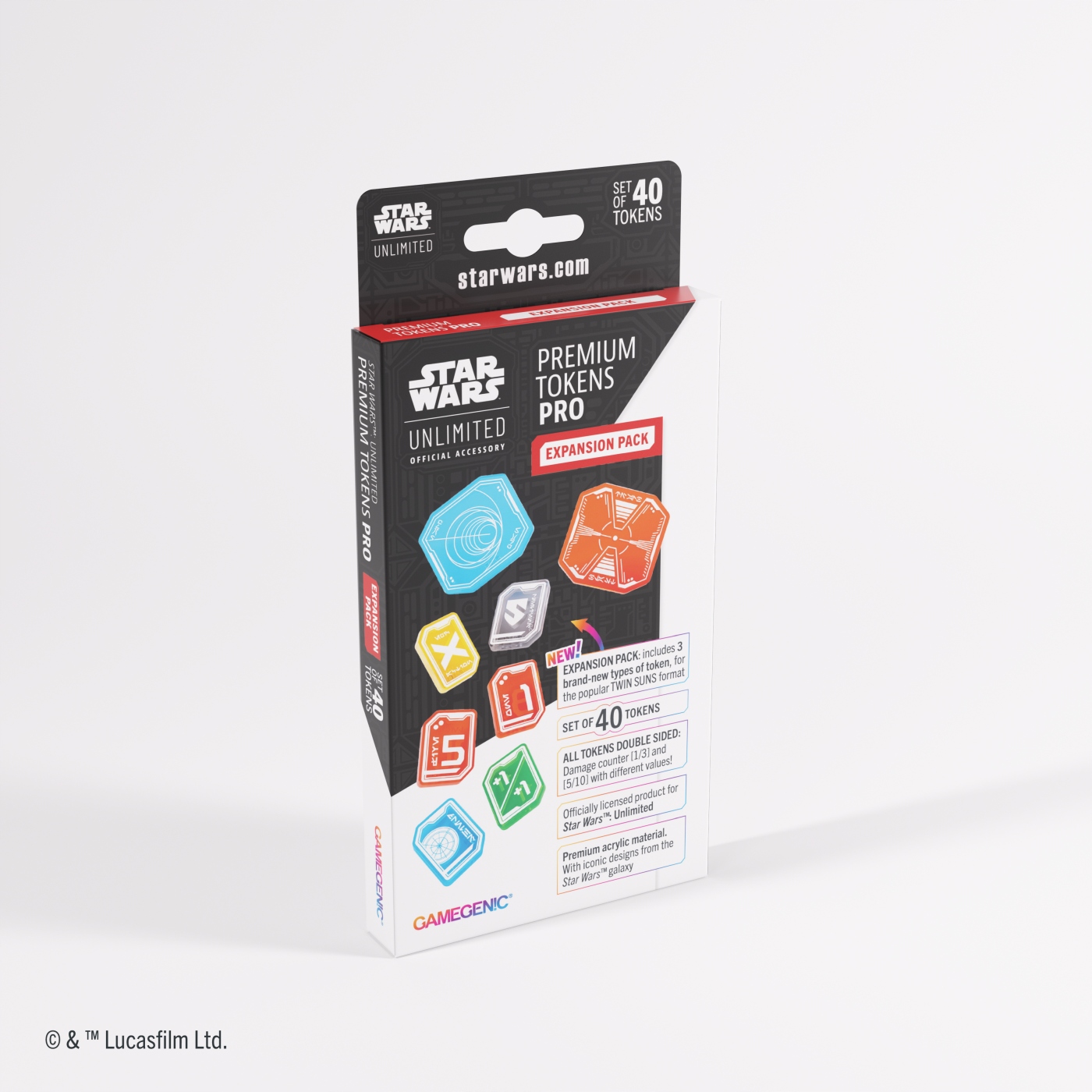 Gamegenic: Game Wars Unlimited Cart Game - Premium Tokens Pro розширення - це ідеальний спосіб доповнити космічну атмосферу саги «Зоряні війни» під час вашої наступної гри в «Зоряних війнах: необмежений у форматі Twin Suns». Набір містить 40 жетонів, кожен з яких містить елементи, впізнавані для кожного шанувальника «Зоряних воєн», які полегшують геймплей, допомагаючи гравцям відстежувати елементи геймплея, такі як пошкодження, досвід, щит і навіть модифікатори. У цьому наборі є 3 нові дизайни жетонів, адаптовані до ігор на Twin Suns.