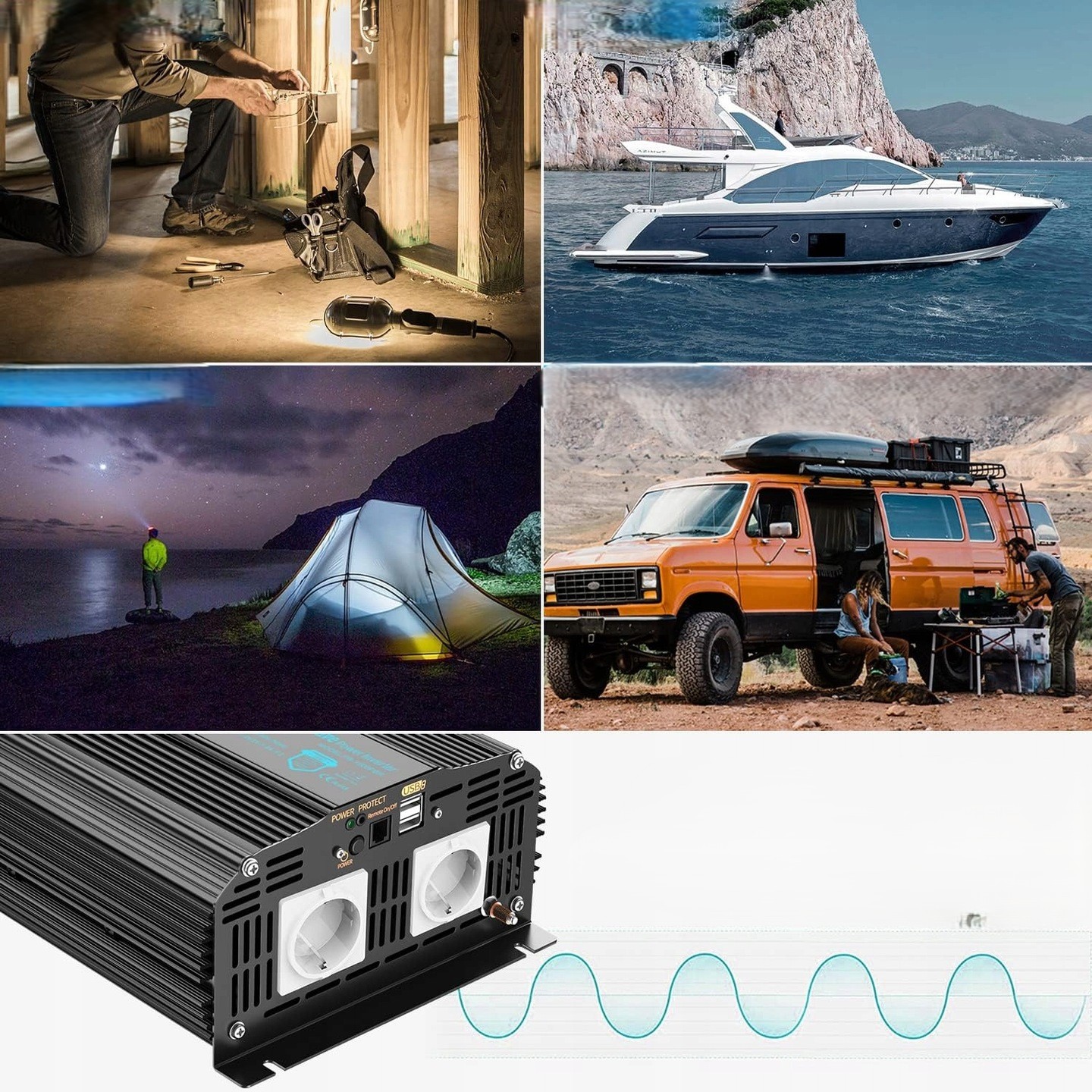 - синусоїдальний інвертор 2000 Вт - забезпечує безперервну потужність від 2000 Вт, 12 В до 230 В інвертора. Він оснащений 2 розетками ЄС та 2 x 2.4 та USB -портами. Ця чорна модель має всередині магнітної кільцевої структури, яка може керувати радіо з низьким рівнем РФ.