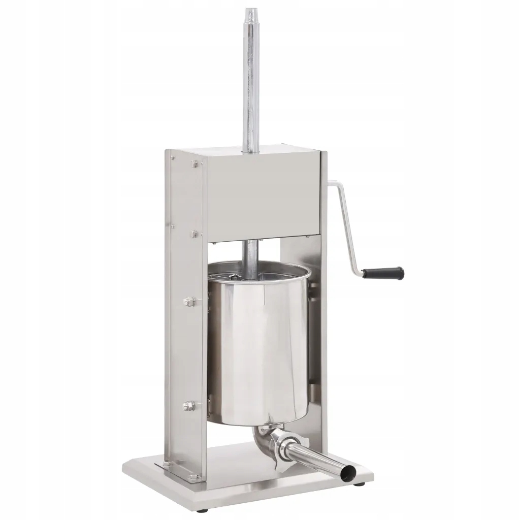 Мінчком з нержавіючої сталі є 10-літровий контейнер, який можна нахилити і видалити, щоб легко заповнити м'ясо та чистити. Ручні кривошипи активують поршень, який стискає начинку через трубу. Більше того, набір включає 3 взаємозамінні послідовності в різних розмірах, які відповідатимуть вашим вимогам.